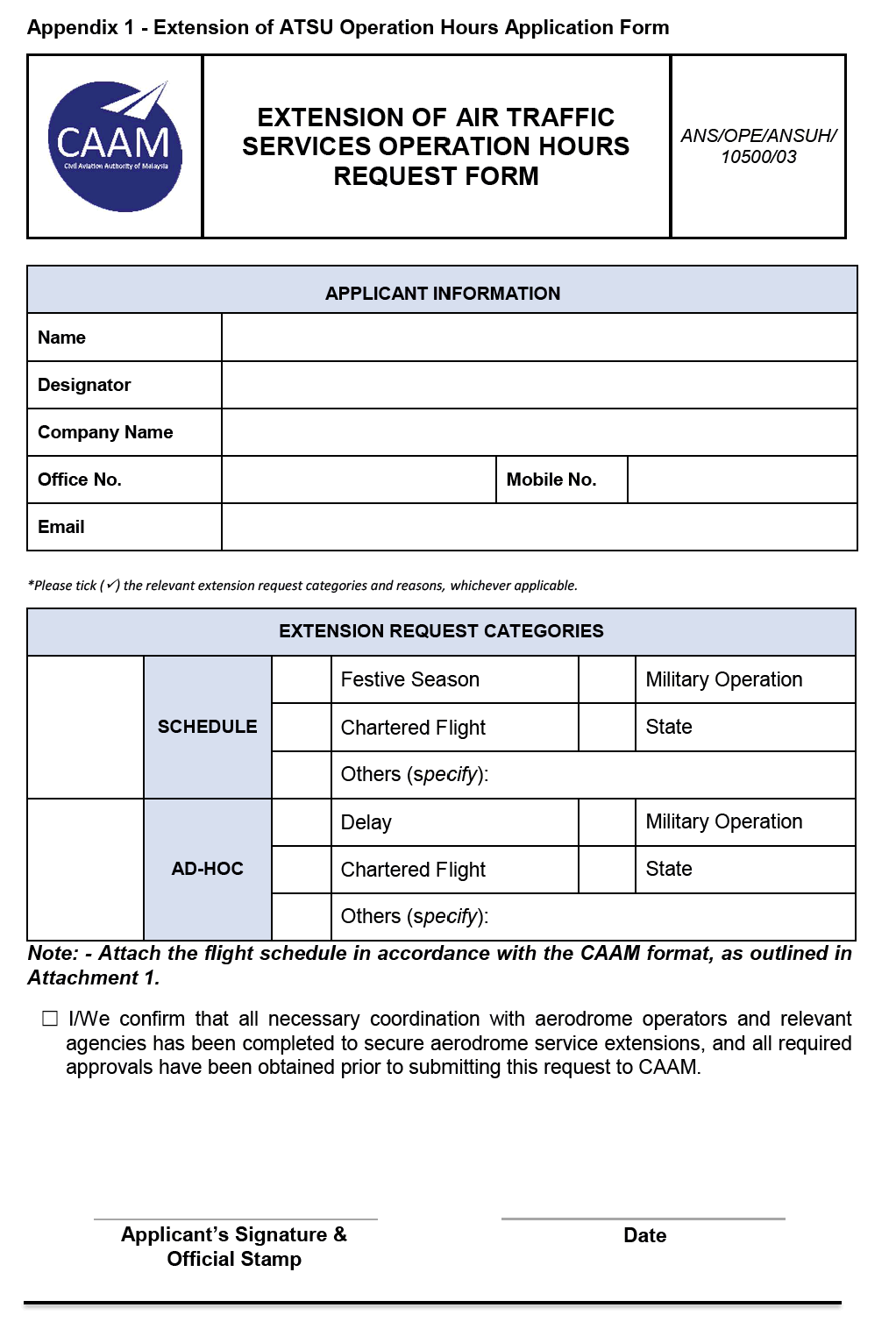 3.5 For ad-hoc extension requests, air operators shall submit requests with a completed Extension of ATS Operating Hours Application Form via email to CAAM’s Operations Control Centre (OCC) at occ.group@caam.gov.my.