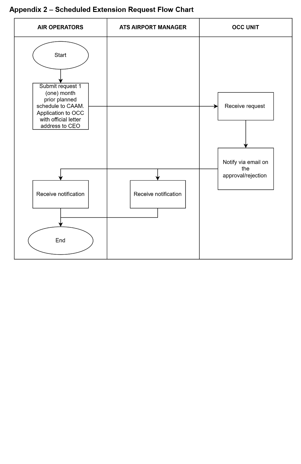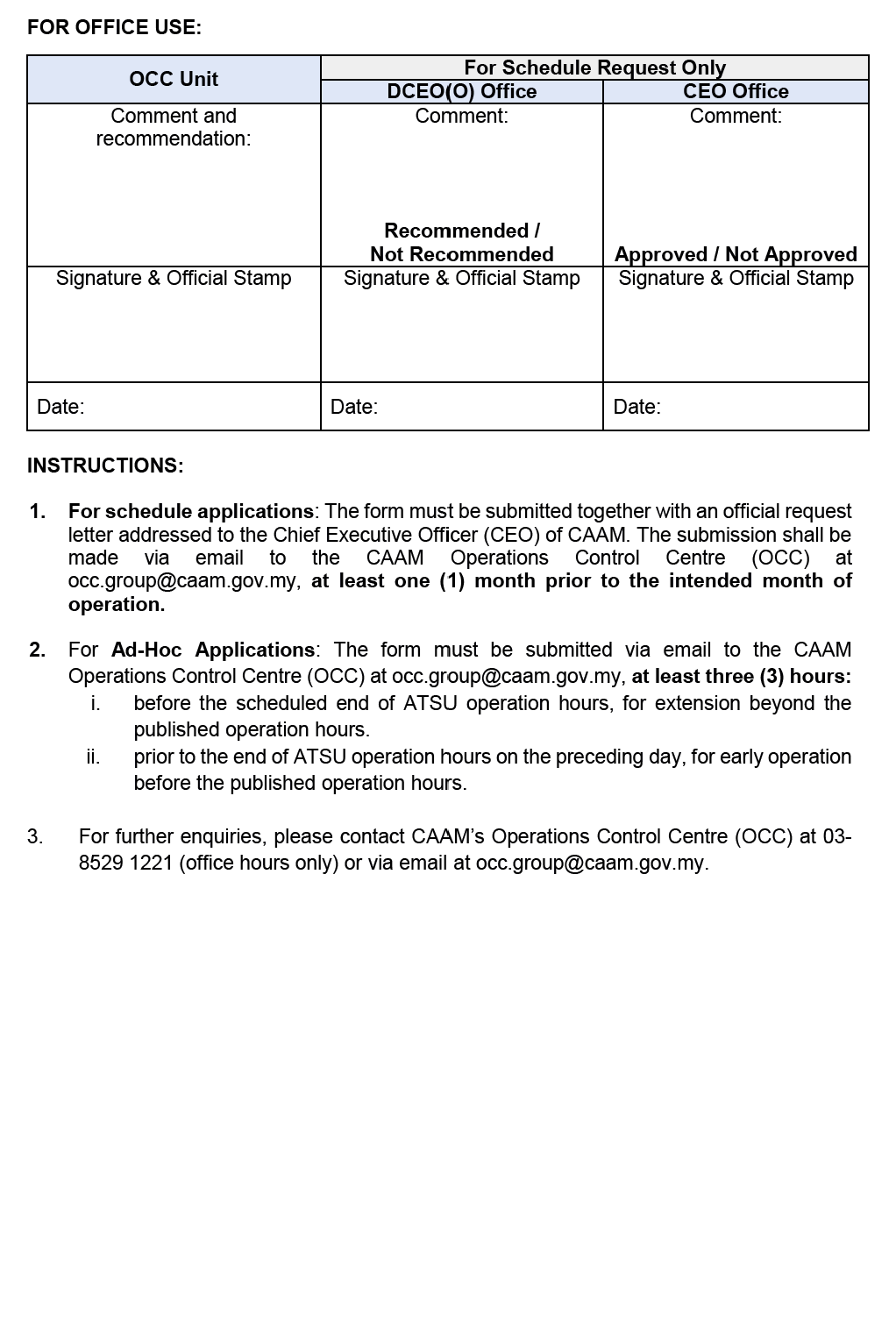 3.4 For scheduled extension requests, air operators shall submit requests with a completed Extension of ATS Operating Hours Application Form, accompanied by an official request letter addressed to the Chief Executive Officer (CEO) of CAAM. Submissions must be sent via email to CAAM’s Operations Control Centre (OCC) at occ.group@caam.gov.my.