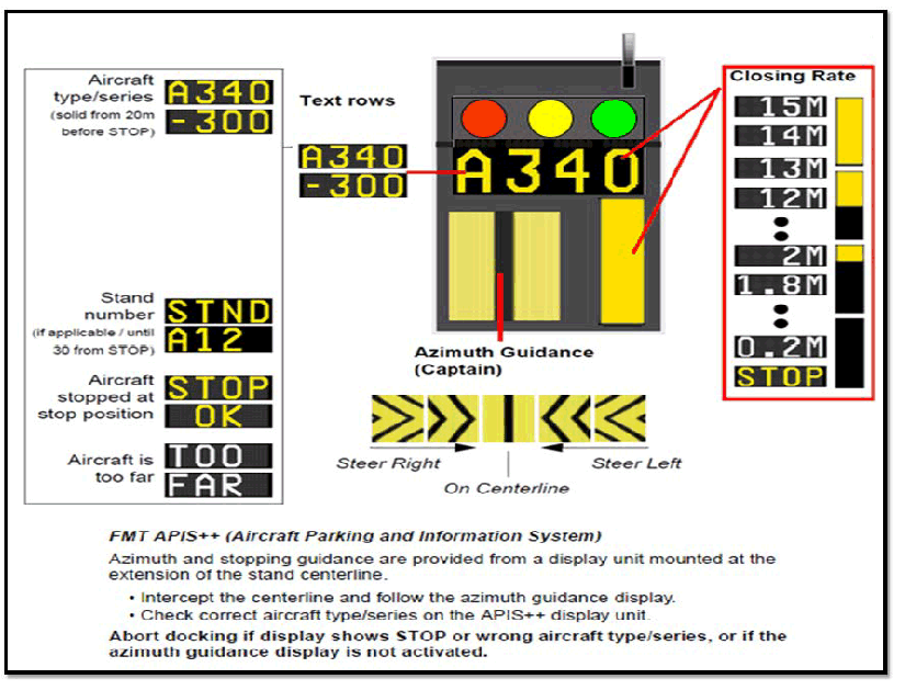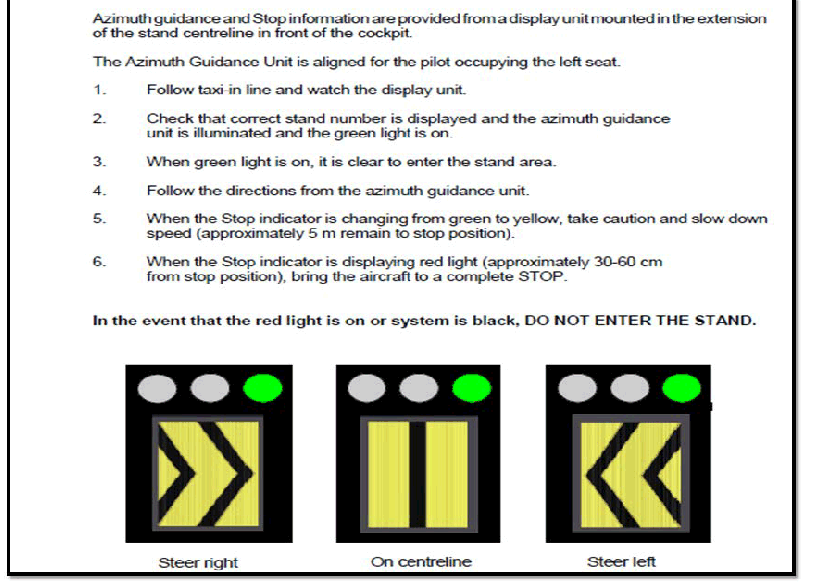 TRACKING The system has captured the aircraft and is actively tracking and verifying it. The floating arrows are replaced by a yellow centre line indicator and floating arrow. • A flashing red and/or yellow arrow indicates the direction to turn for azimuth guidance. • The yellow arrow indicates the aircraft position in relation to the centre line. • The centre line “distance-to-go” indicator changes from floating arrows to a filled closing-rate bar. The closing-rate bar shrinks as the aircraft nears its configured stop position. Instructions to Operators: • Check that the correct aircraft type is displayed on the Pilot Display. When the selected and the verified aircraft type match, the message IDENTIFIED appears on the Operator Panel display. | ![]() | Arrow indicated the aircraft a bit on left side and pilot to turn right and make sure no arrow indicated on the left or right. ![]() |