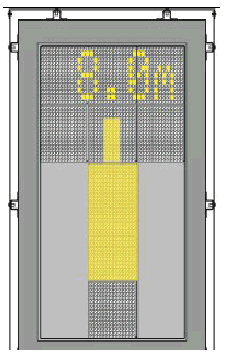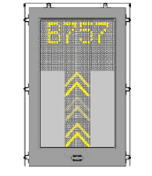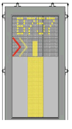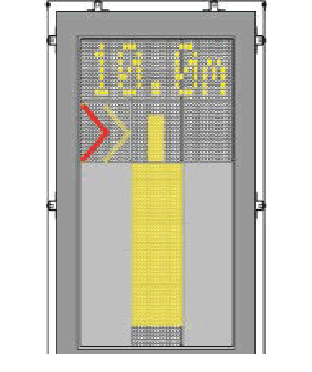 CLOSING RATE The closing rate is the final countdown from a specific distance to the stop-position. A yellow vertical closing rate bar/centreline indicator appears, optionally with a digital countdown indication, depending on the configuration. The closing rate bar showing the distance from stop-position consists of a number of rows representing the remaining distance to go. Each row turns off in steps, beginning 15M from the stop-position as the aircraft approaches, illustrating a shrinking bar from the bottom. As the last row turns off, less than the interval for one row remains until the message STOP appears. A digital countdown (option) shows the distance to stop numerically, with intervals depending on the configuration requirements. The image example illustrates the aircraft in the closing rate distance from stop-position, slightly left of the centre line. The red arrow indicates the direction to steer. | ![]() | Arrow indicated the aircraft a bit on left side and pilot to turn right and make sure no arrow indicated on the left or right. |