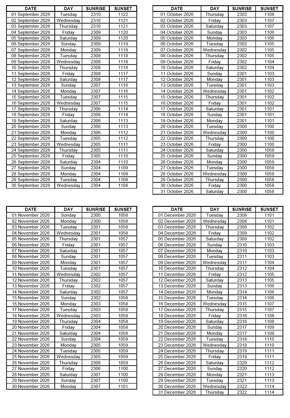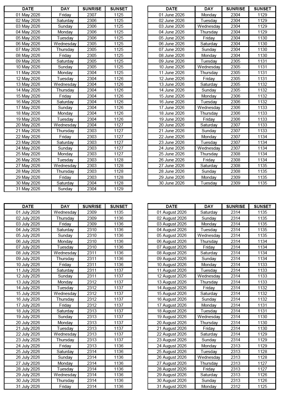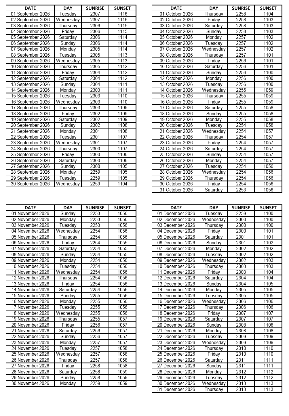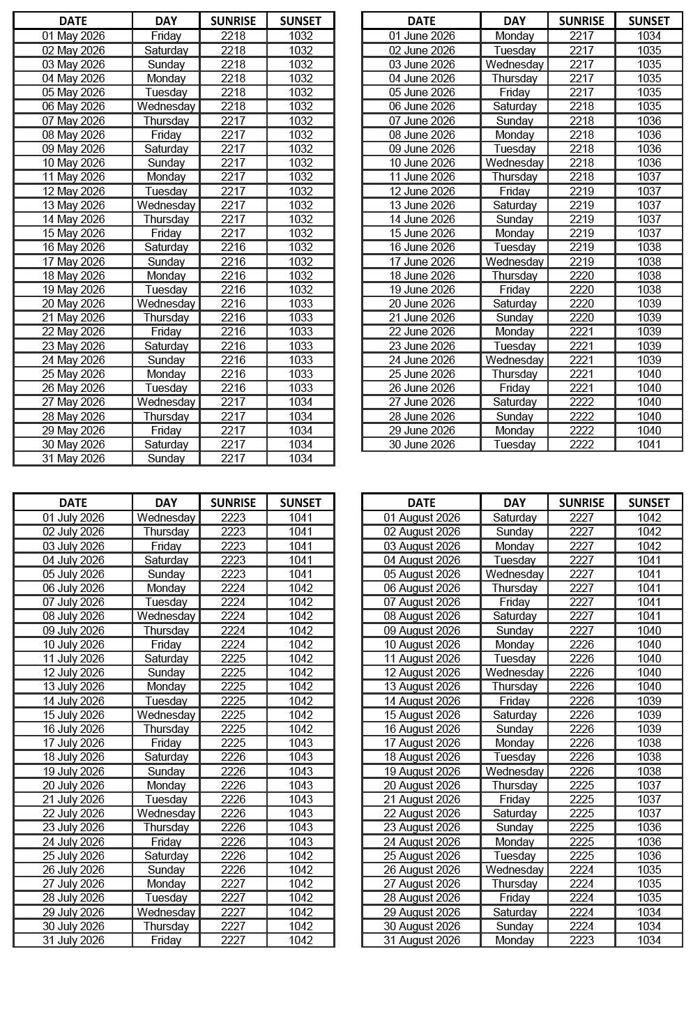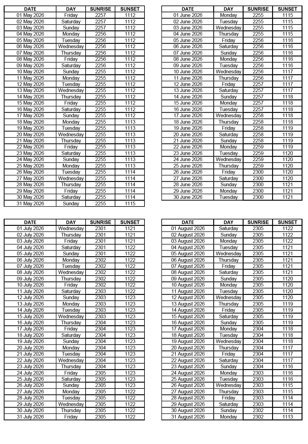 GEN 2.7 SUNRISE/SUNSET TABLES