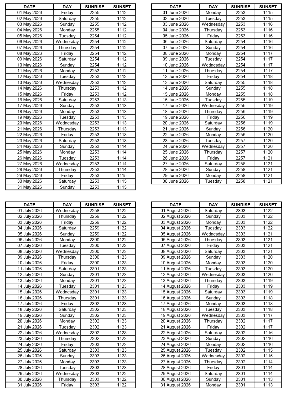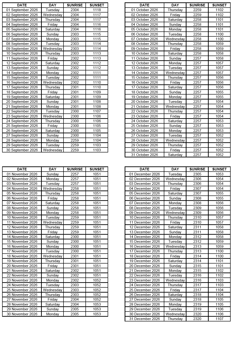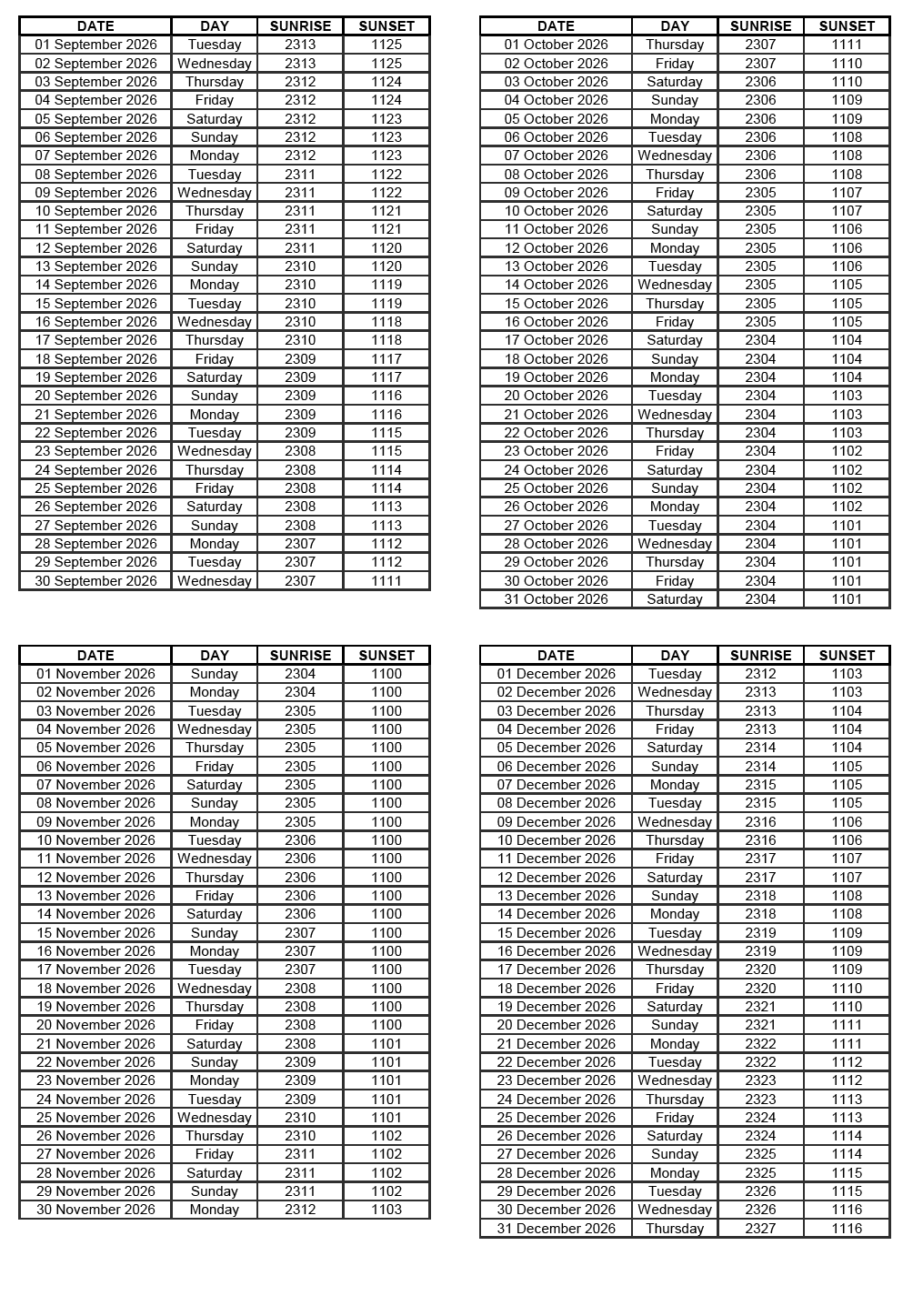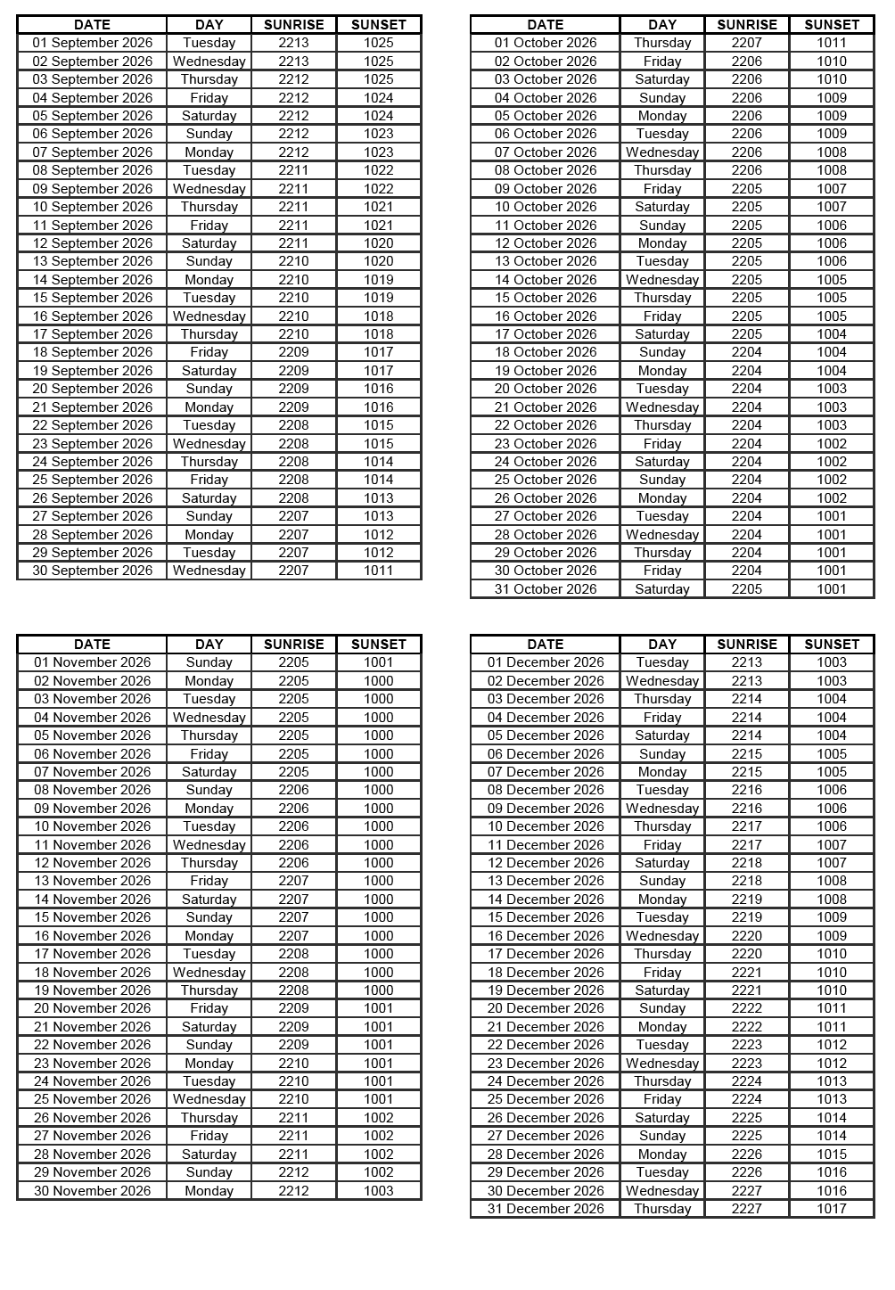 GEN 2.7 SUNRISE/SUNSET TABLES