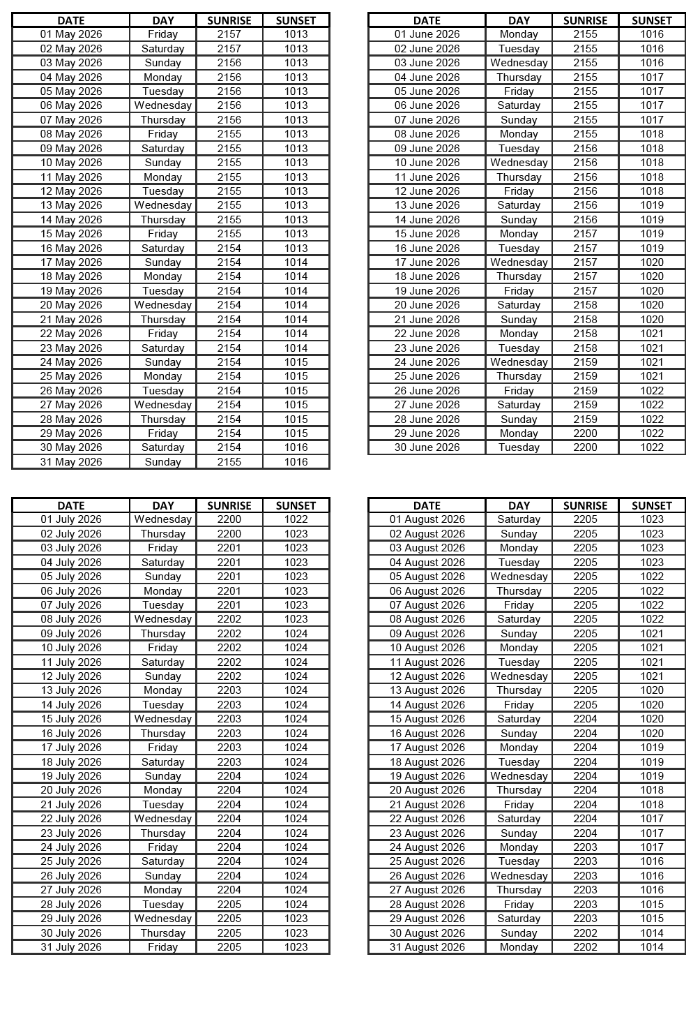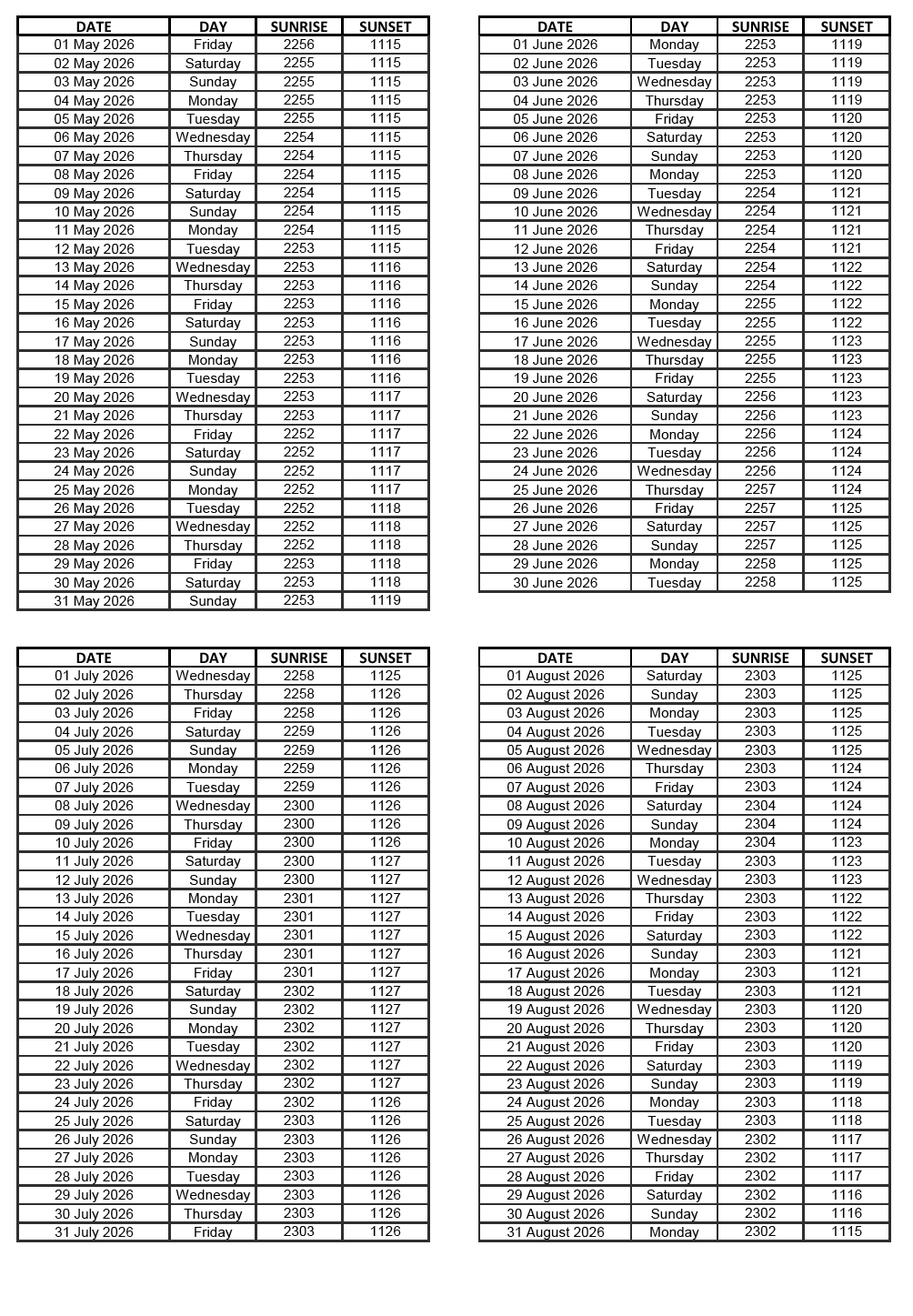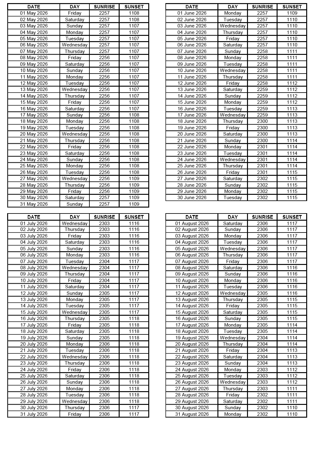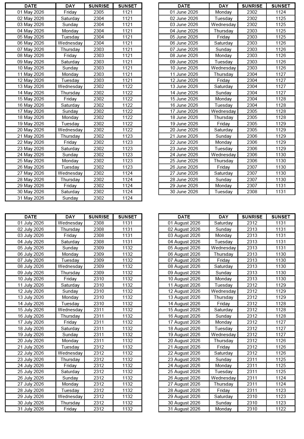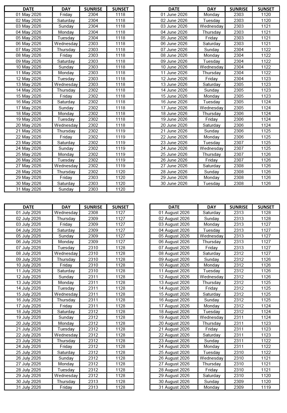 GEN 2.7 SUNRISE/SUNSET TABLES