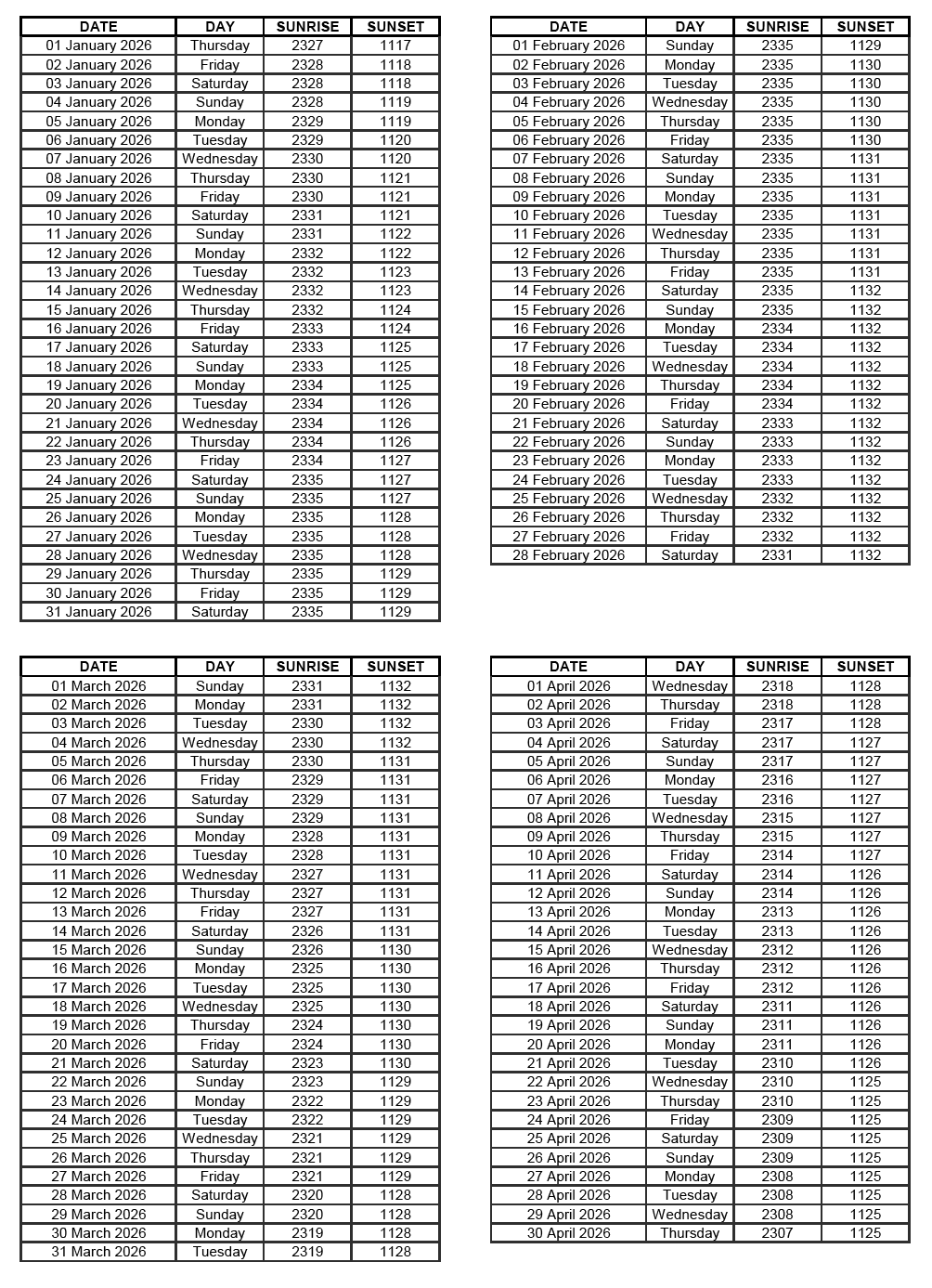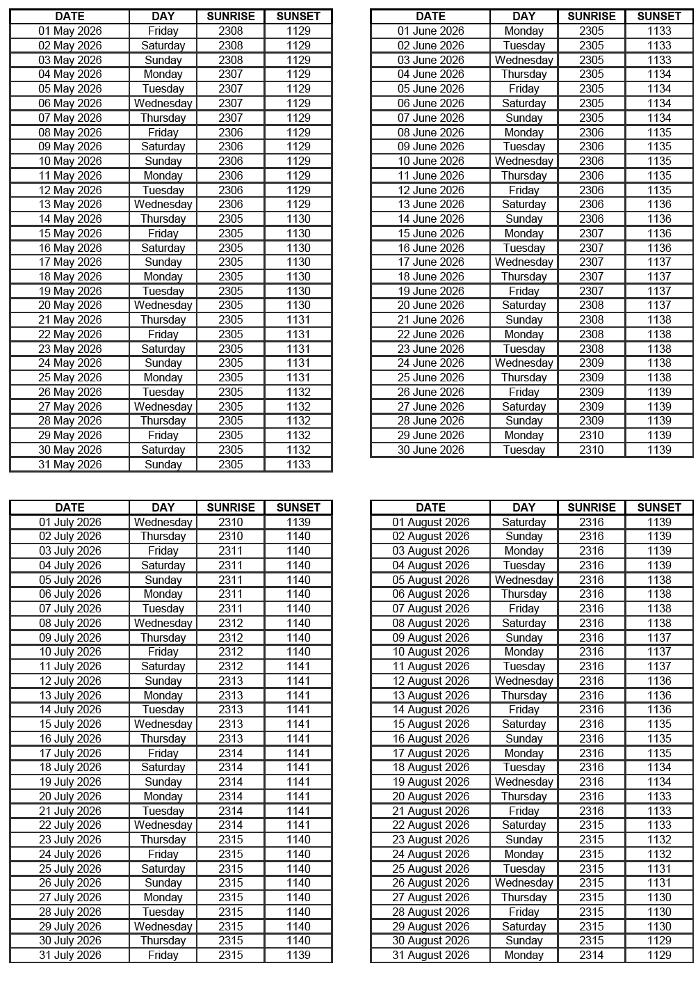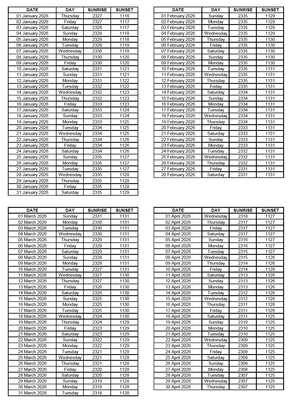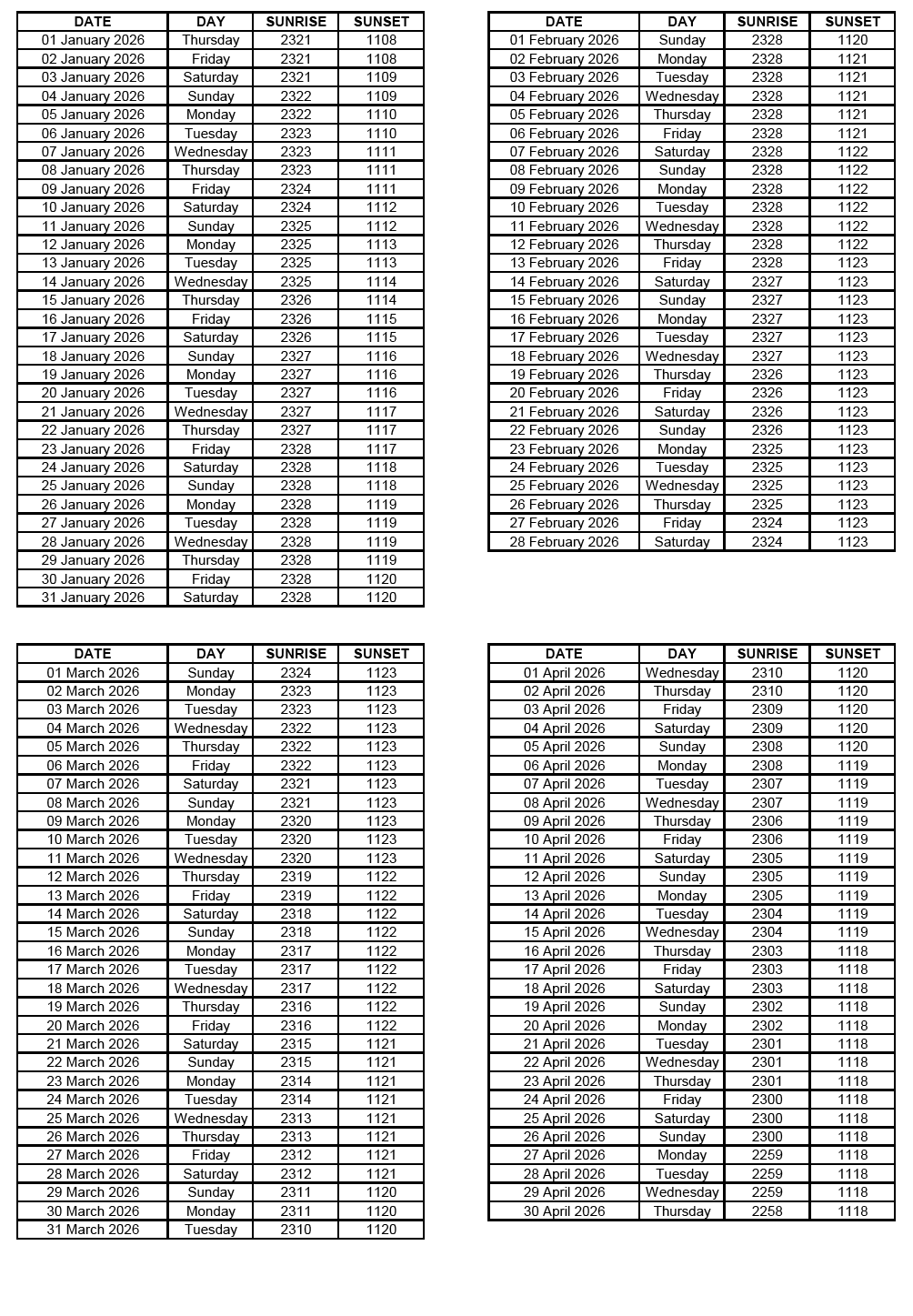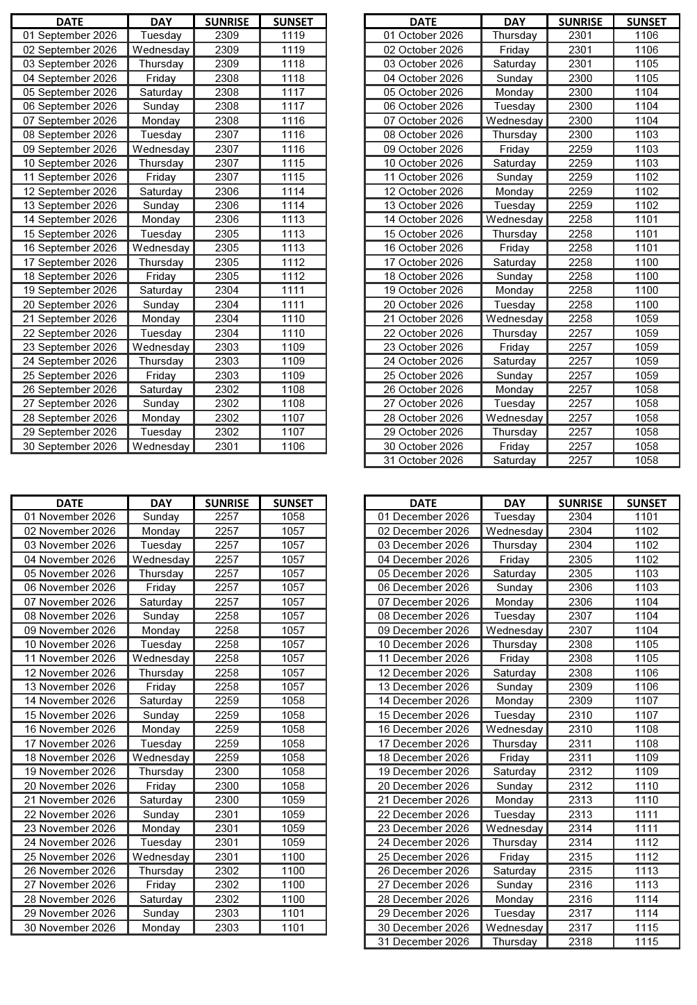 GEN 2.7 SUNRISE/SUNSET TABLES