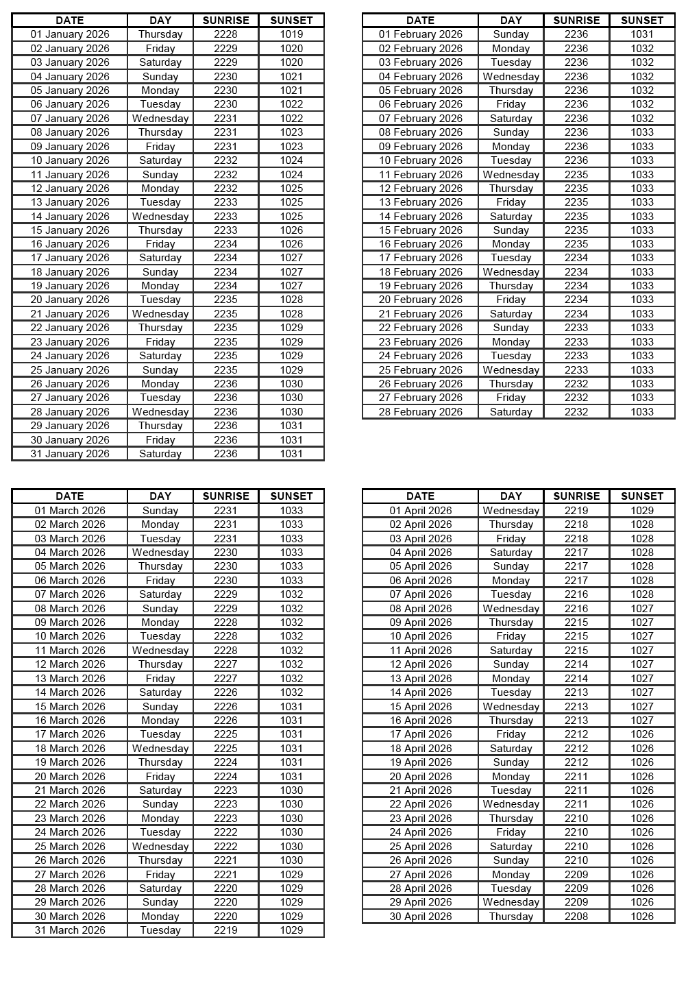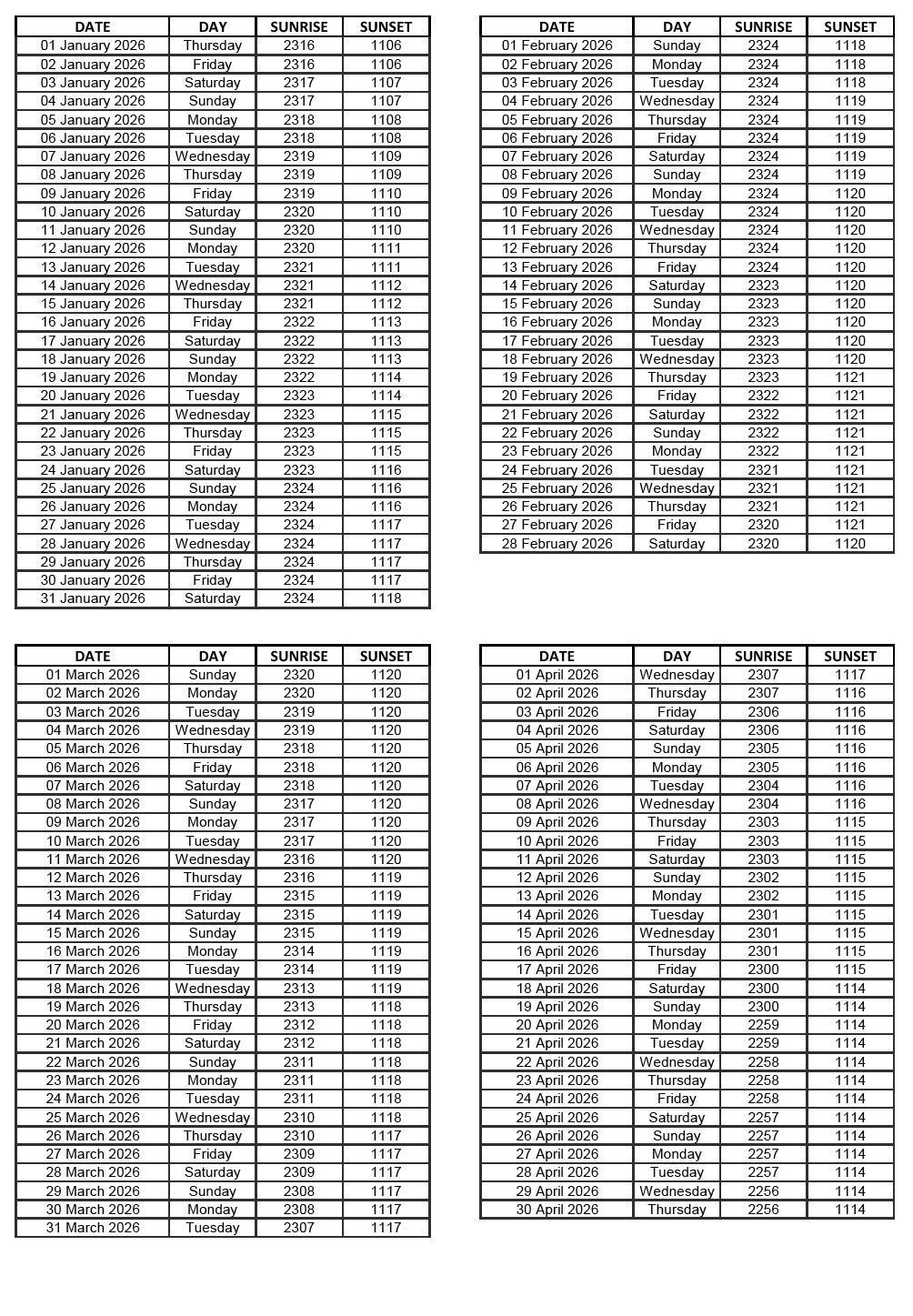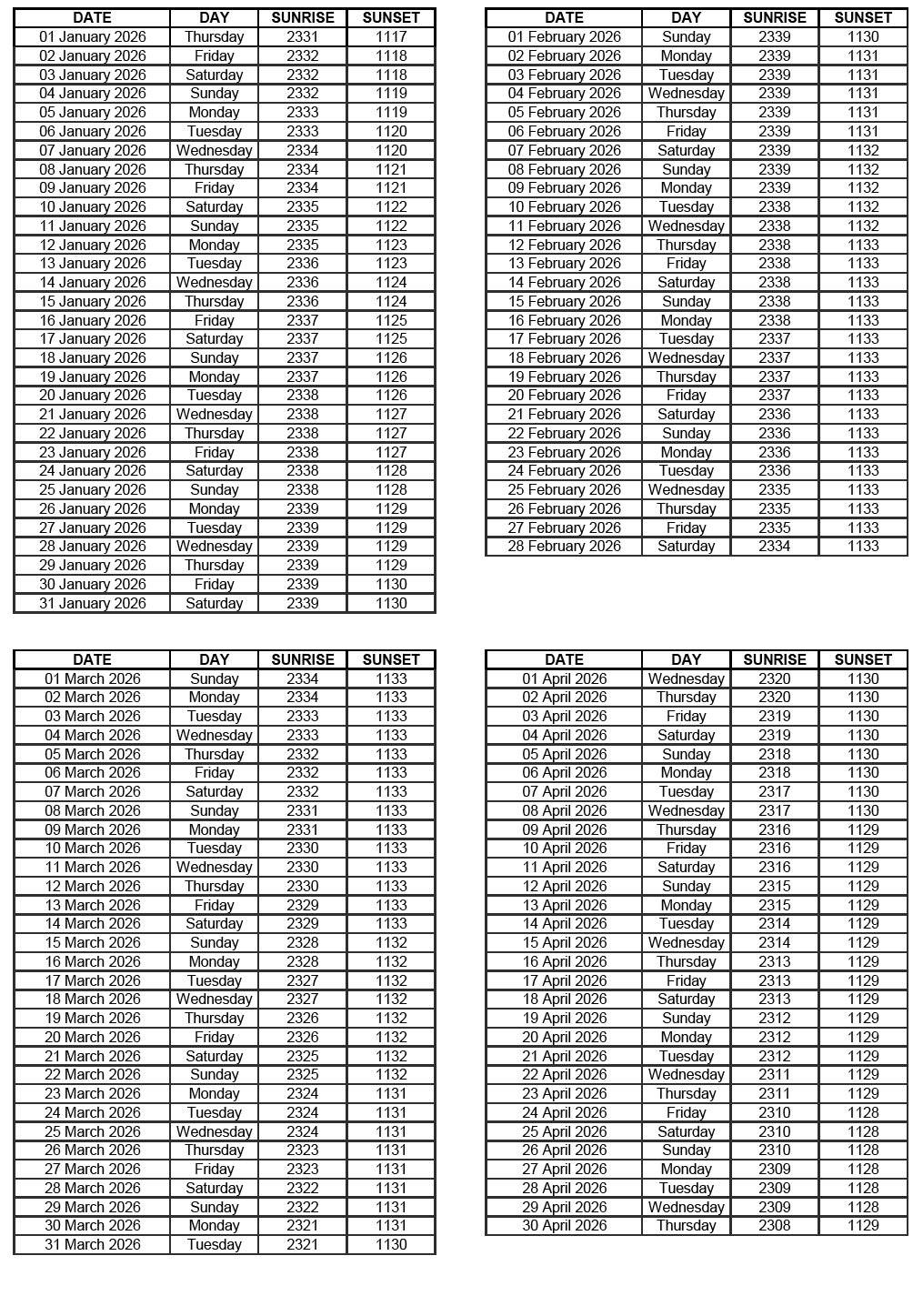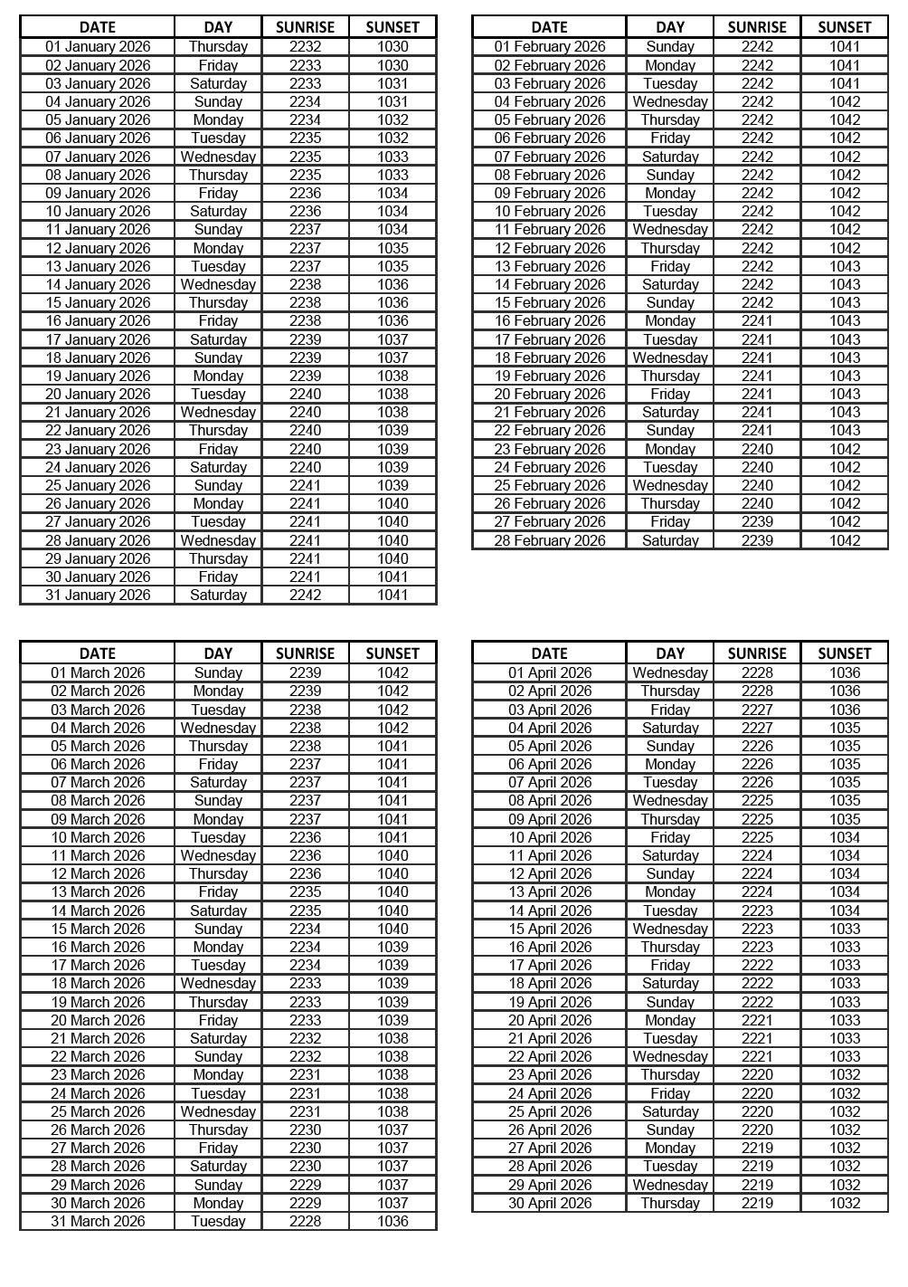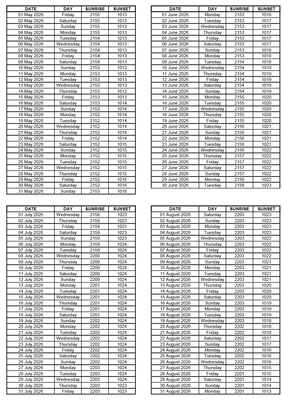 GEN 2.7 SUNRISE/SUNSET TABLES