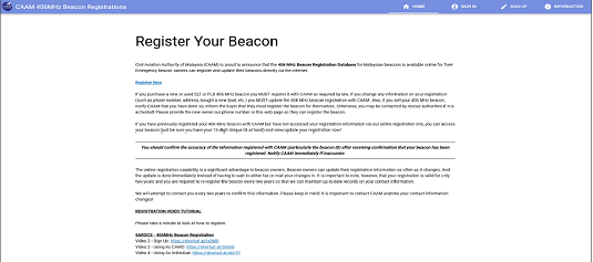 The CAAM 406MHz Beacon Registration portal (see figures below for a snippet of the website) can be accessed via: