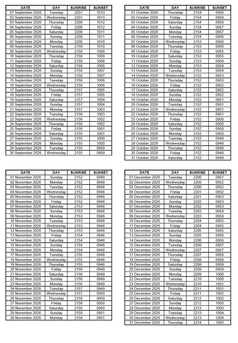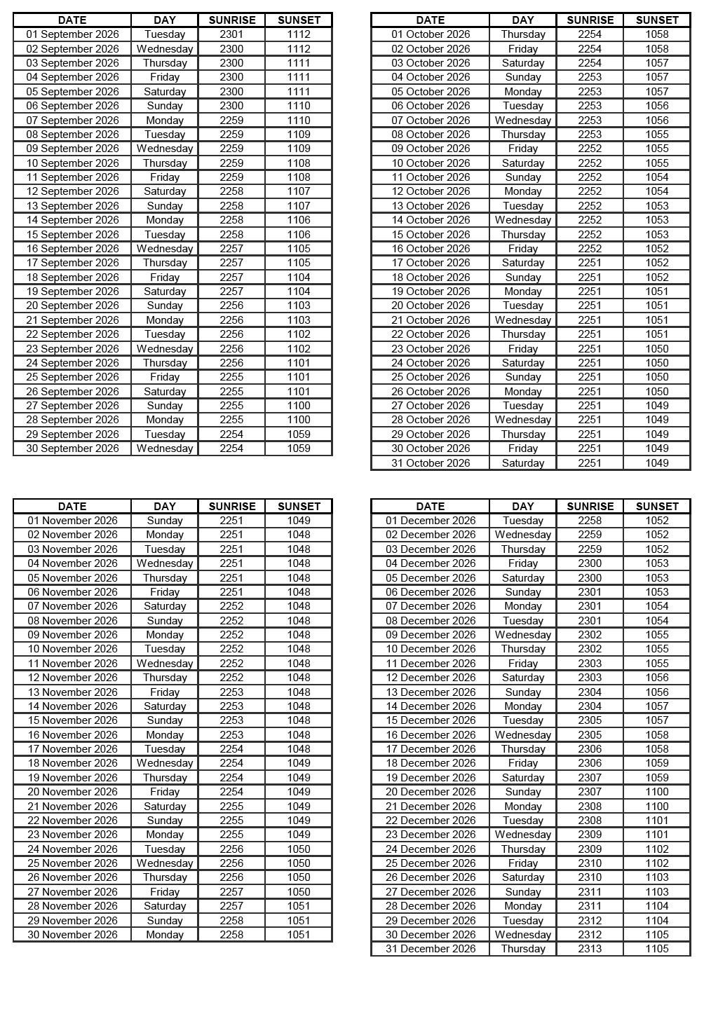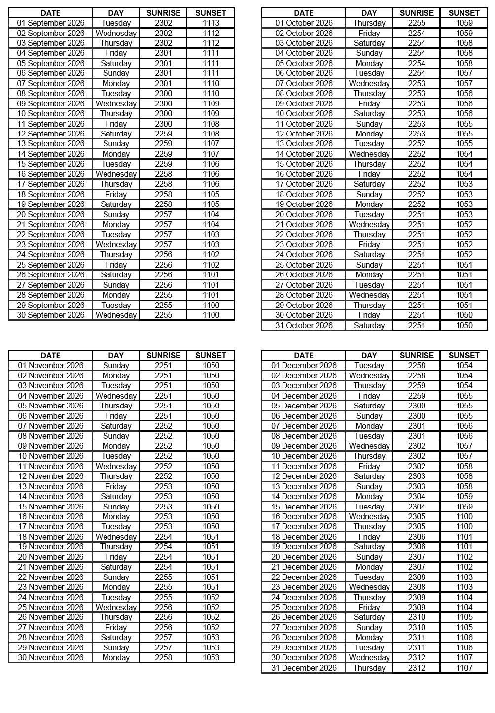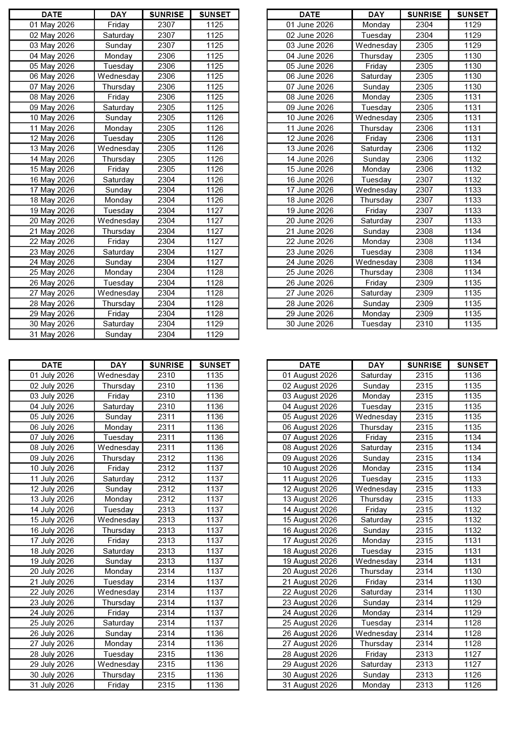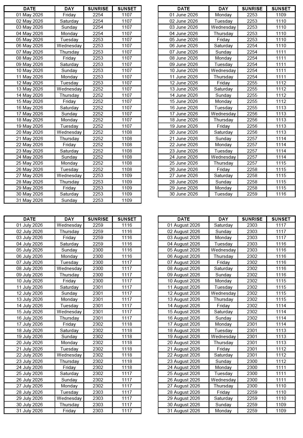GEN 2.7 SUNRISE/SUNSET TABLES