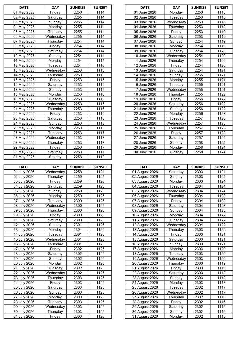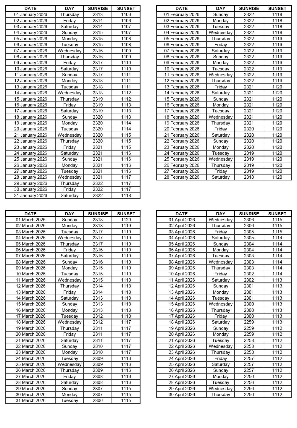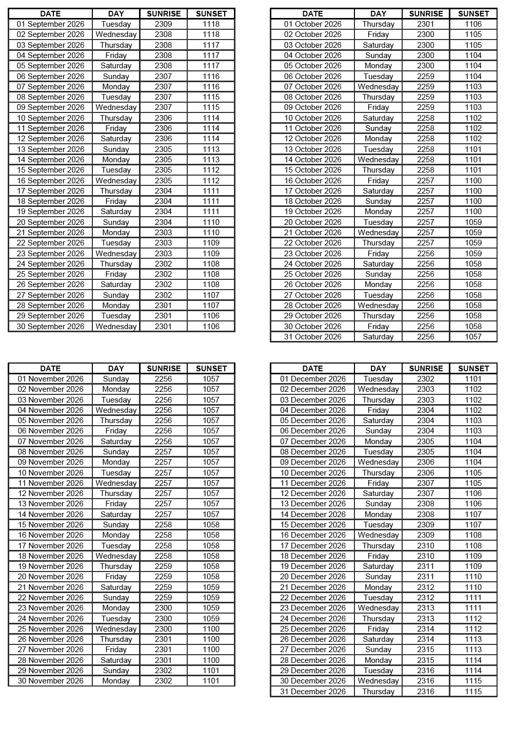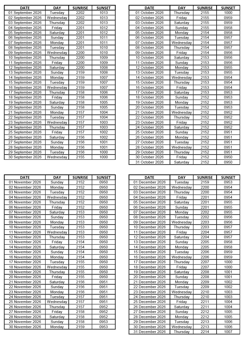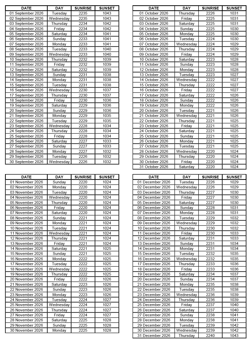 GEN 2.7 SUNRISE/SUNSET TABLES