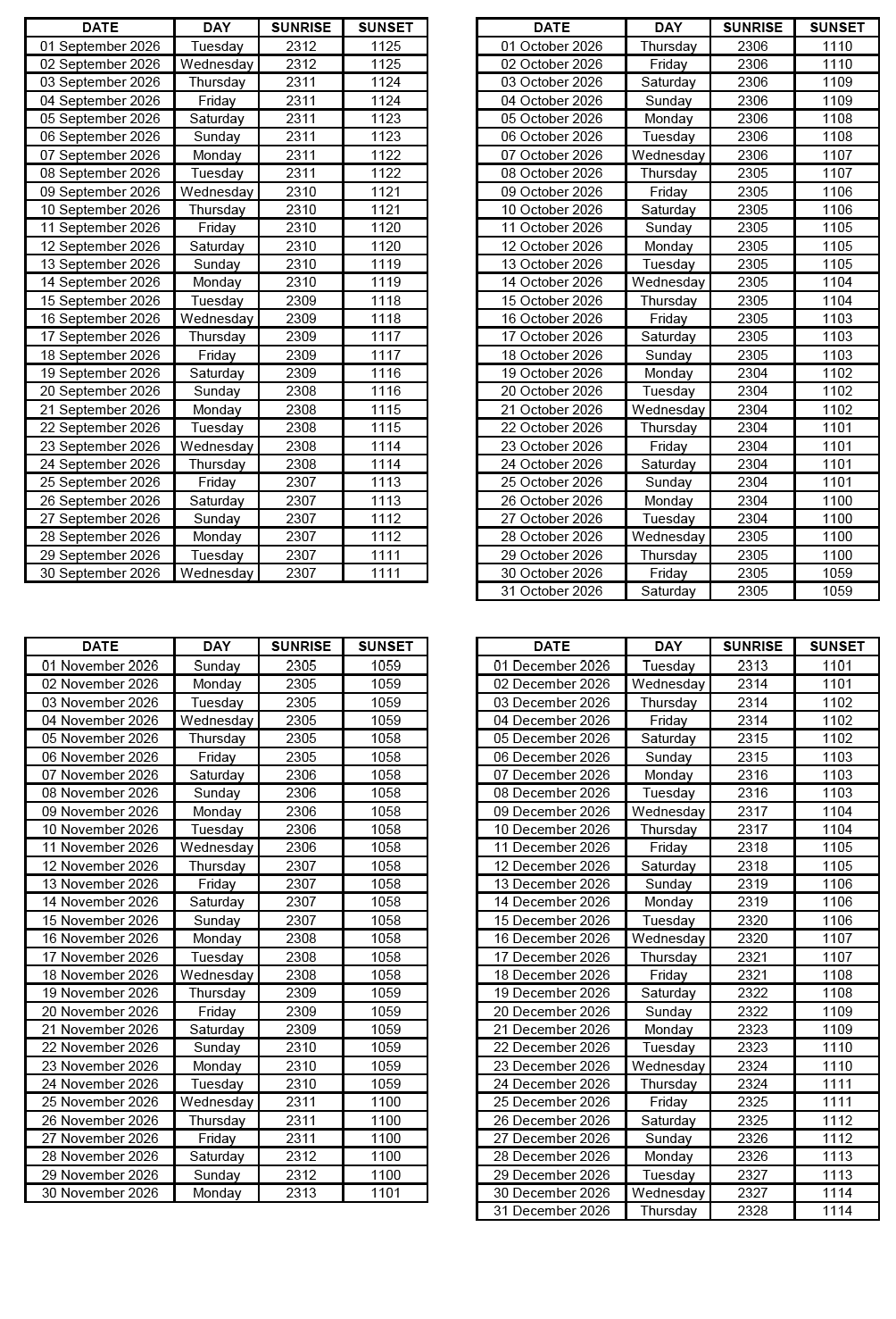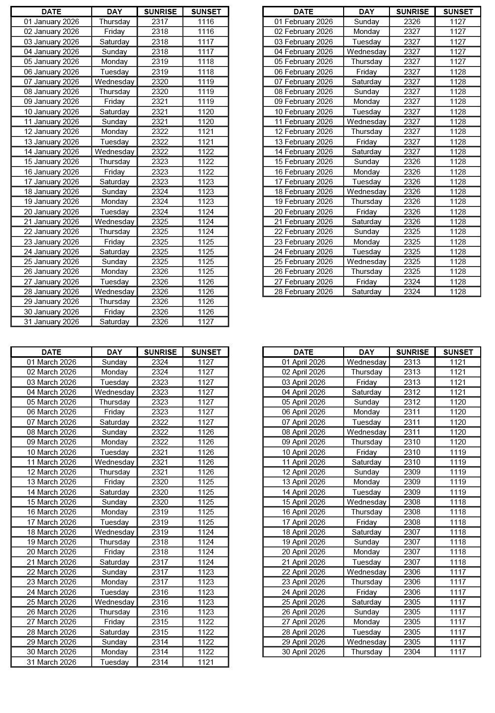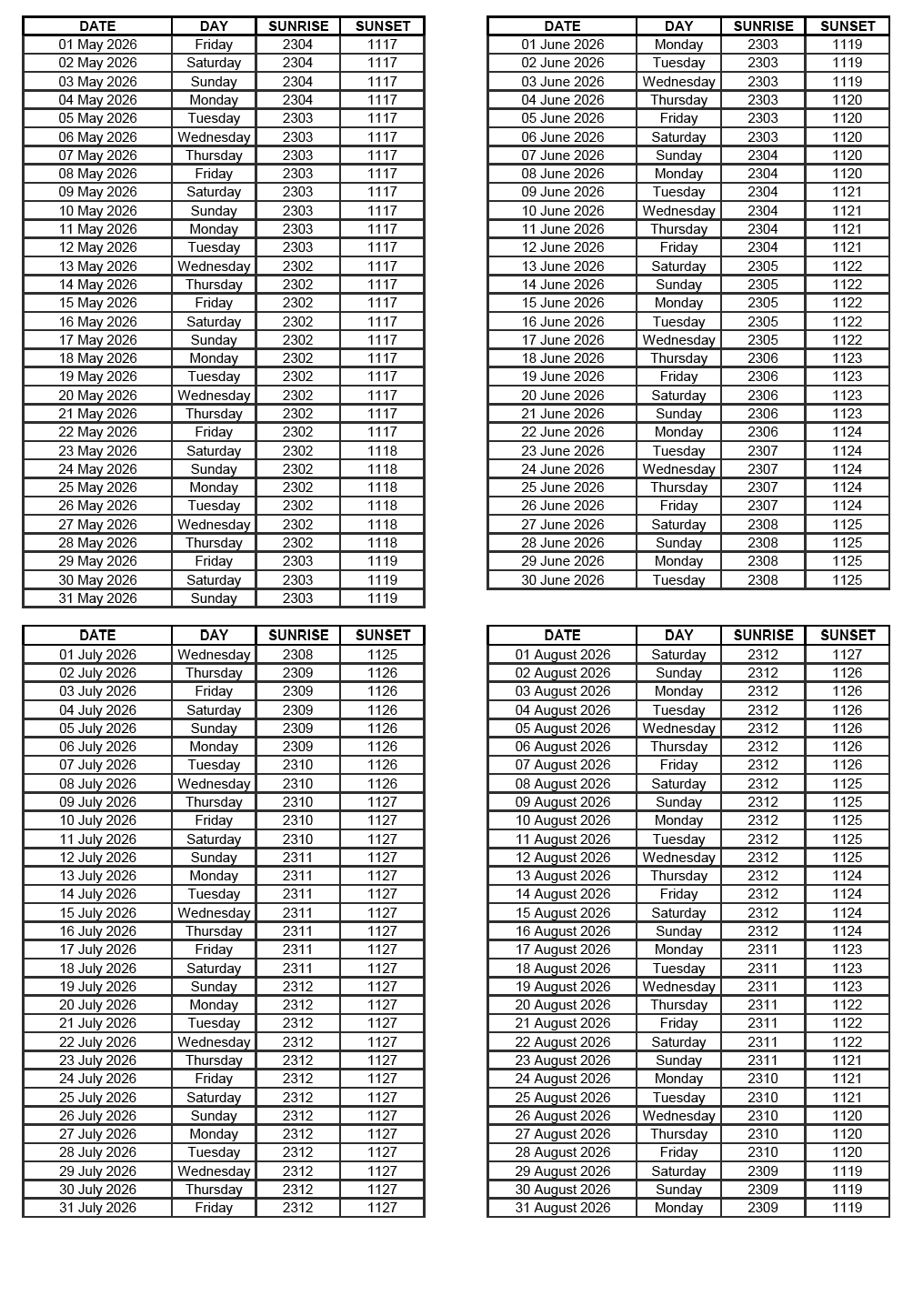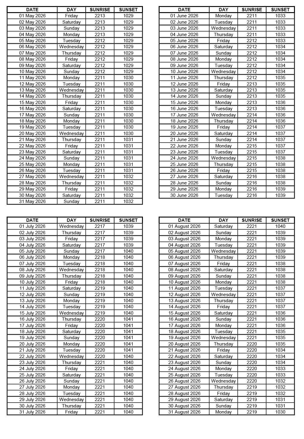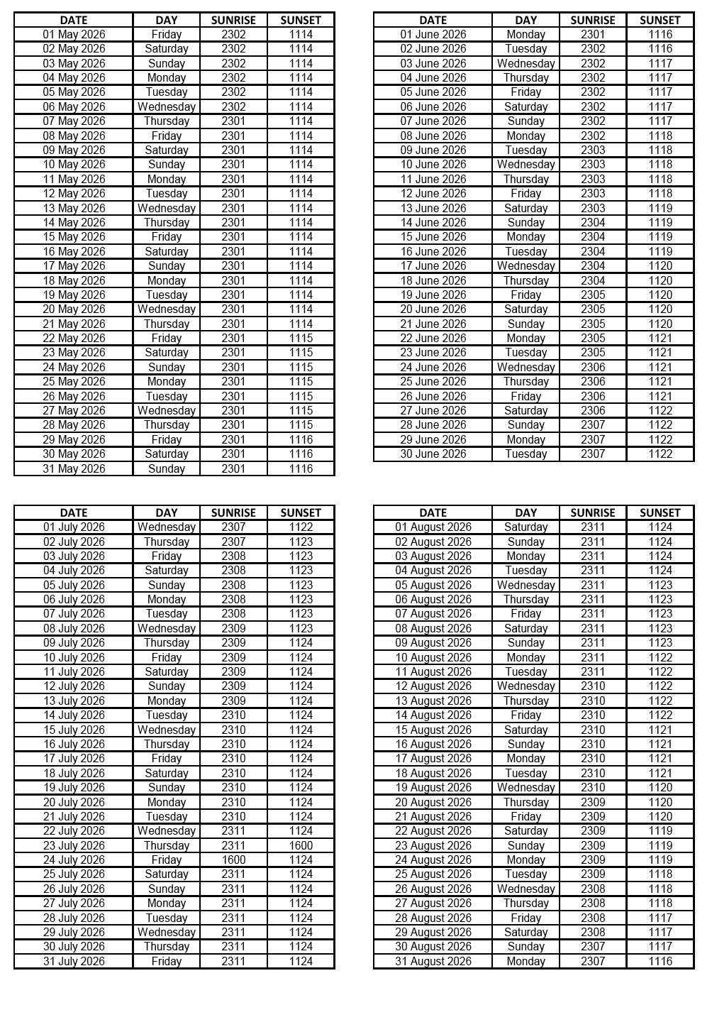 GEN 2.7 SUNRISE/SUNSET TABLES
