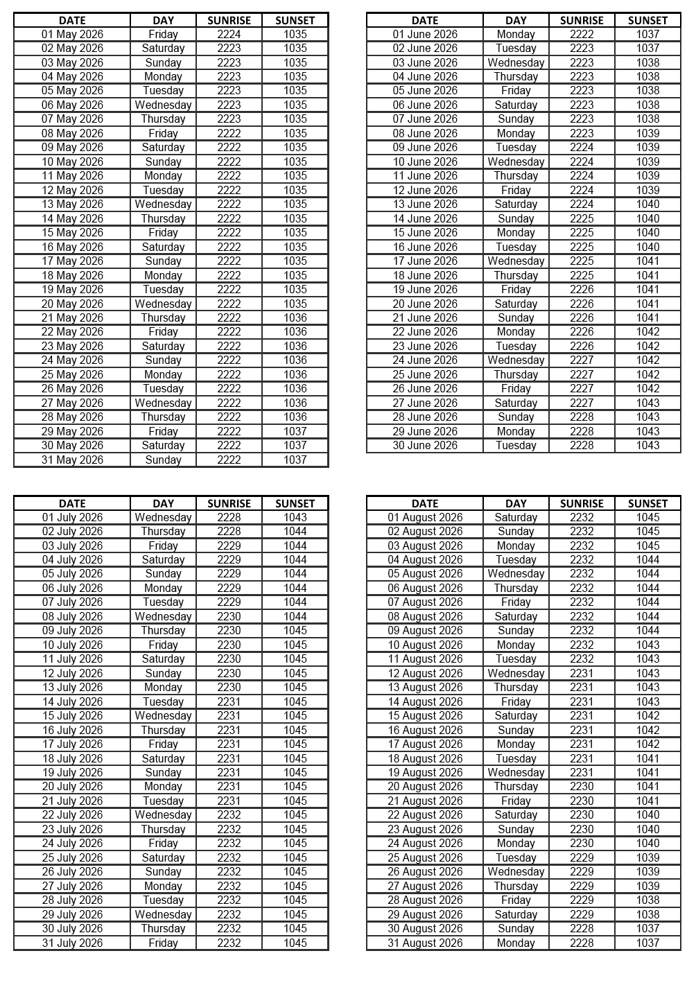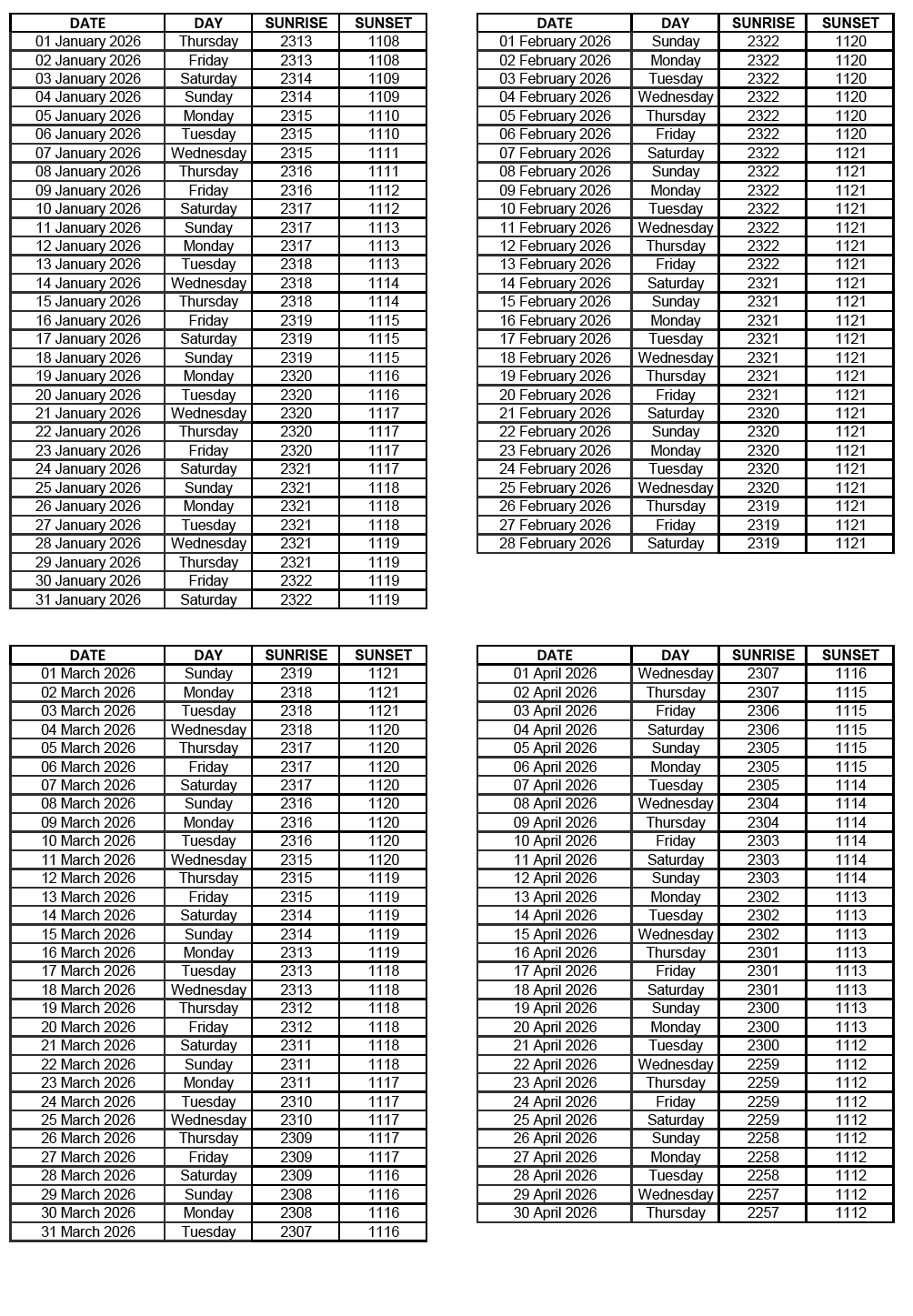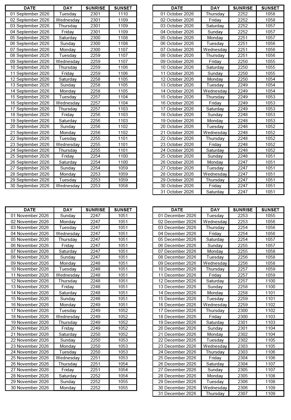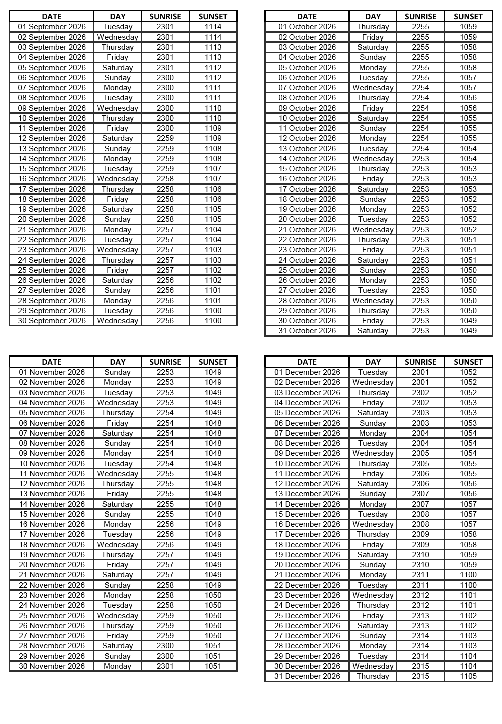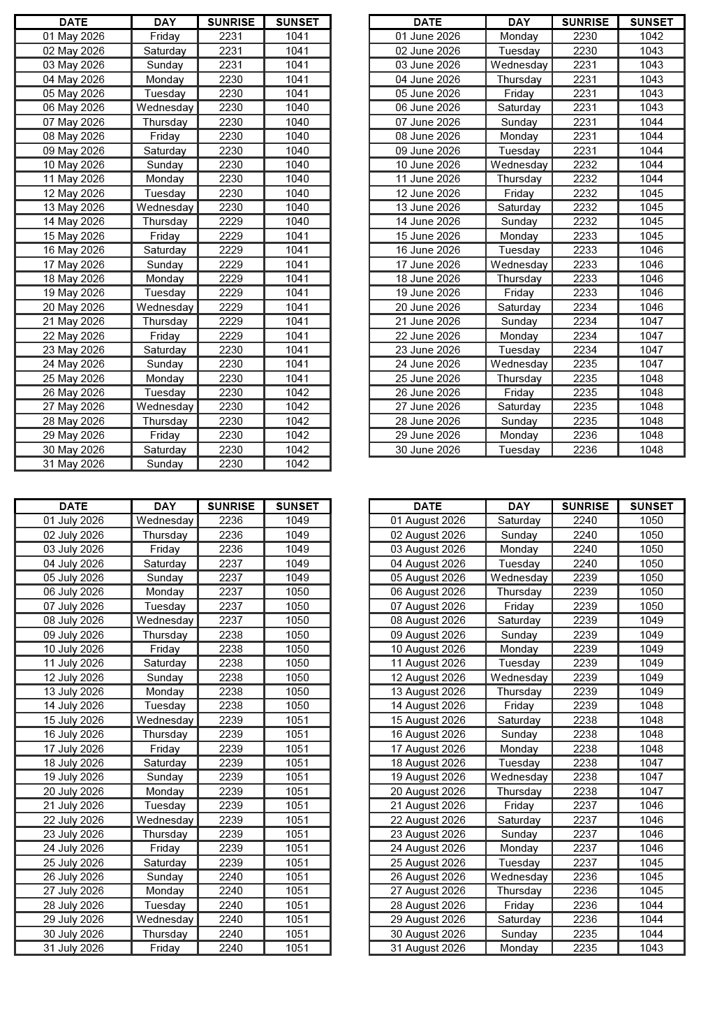 GEN 2.7 SUNRISE/SUNSET TABLES