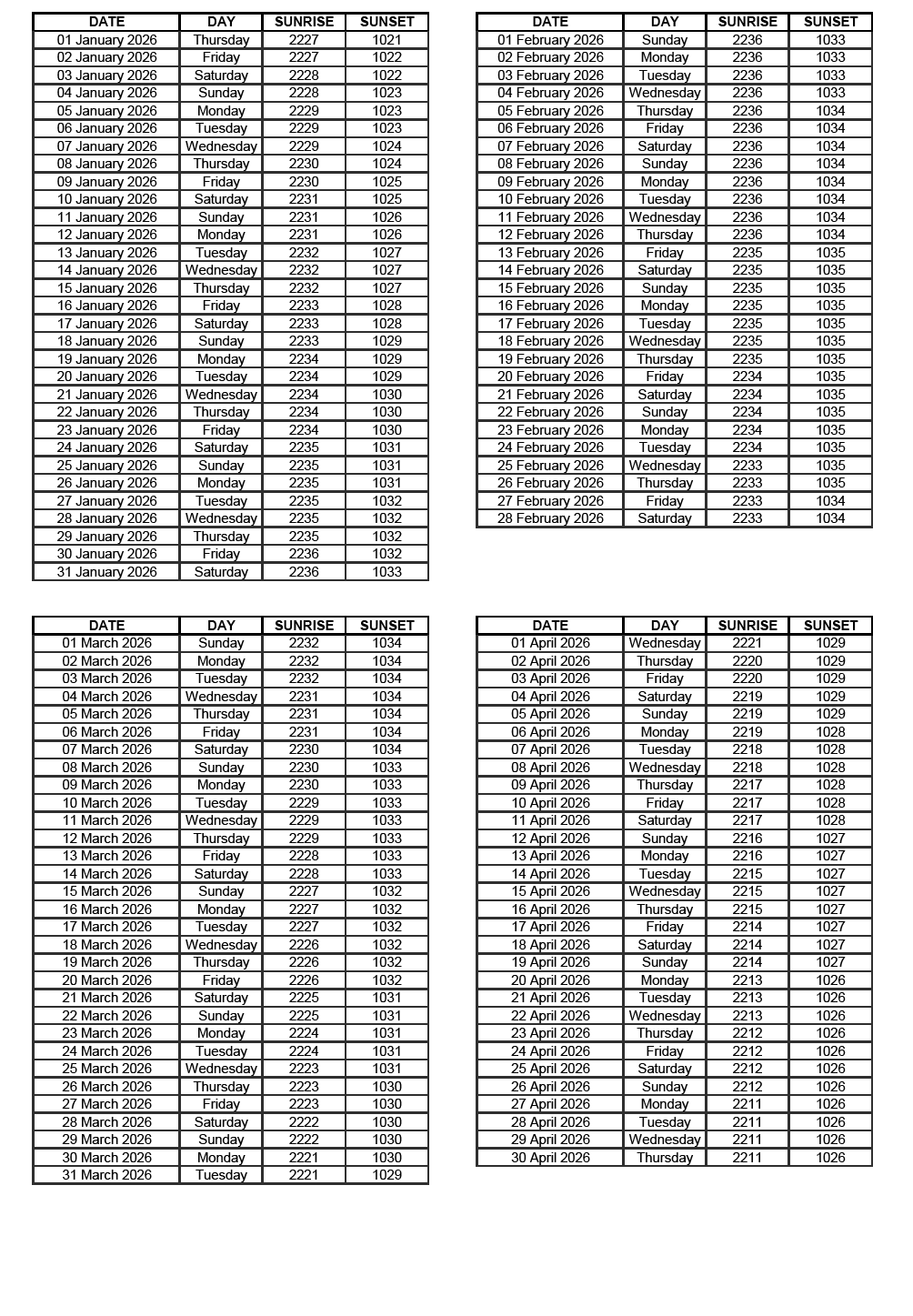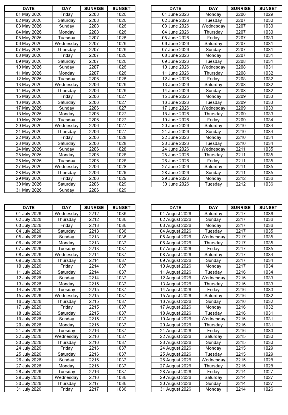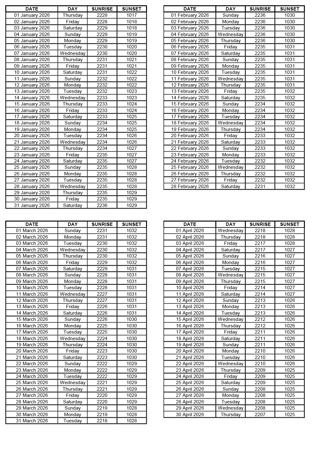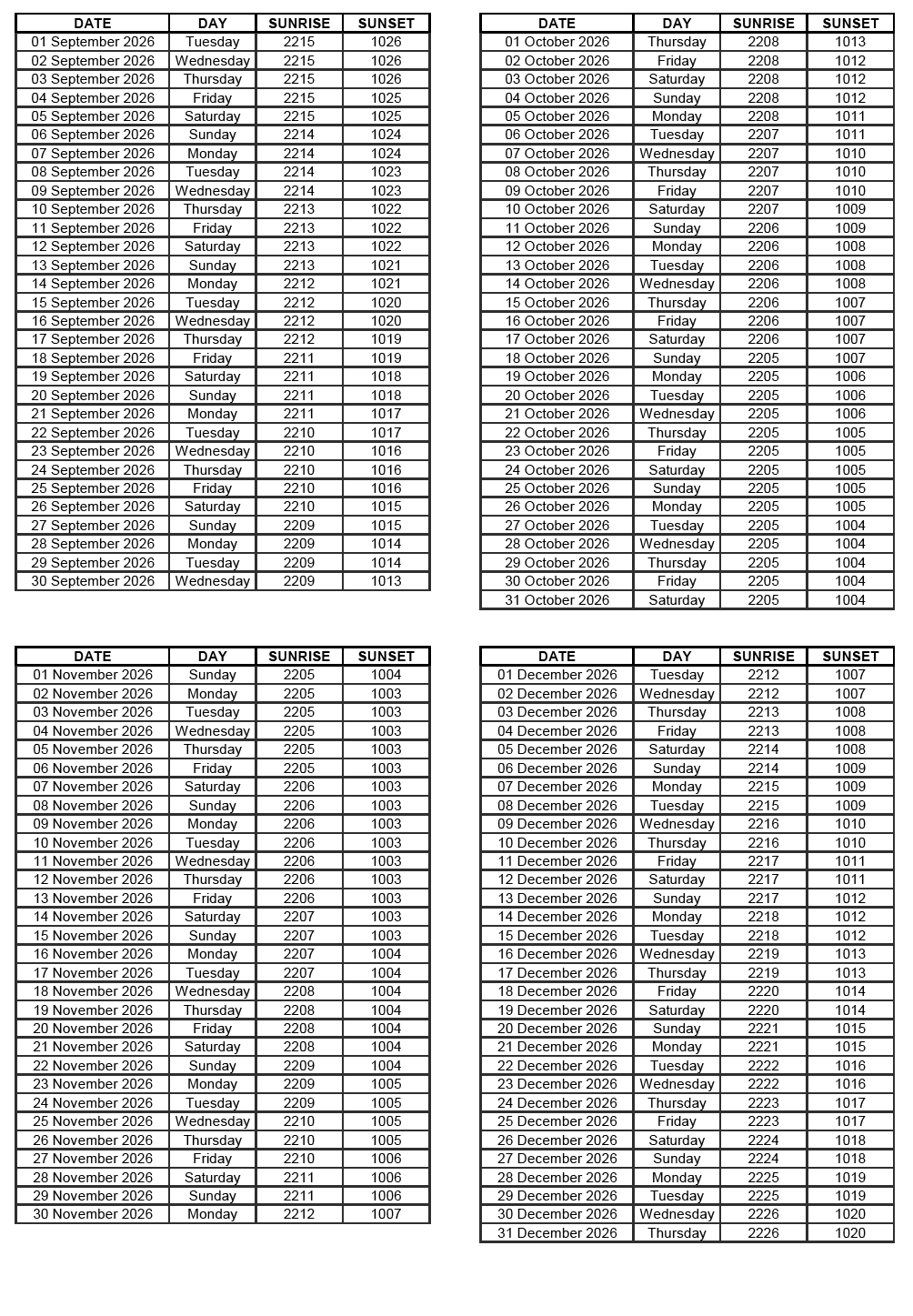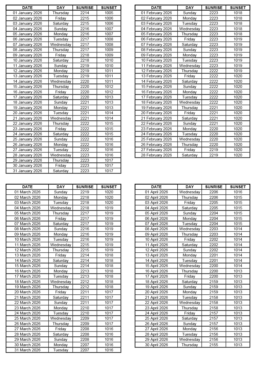 GEN 2.7 SUNRISE/SUNSET TABLES