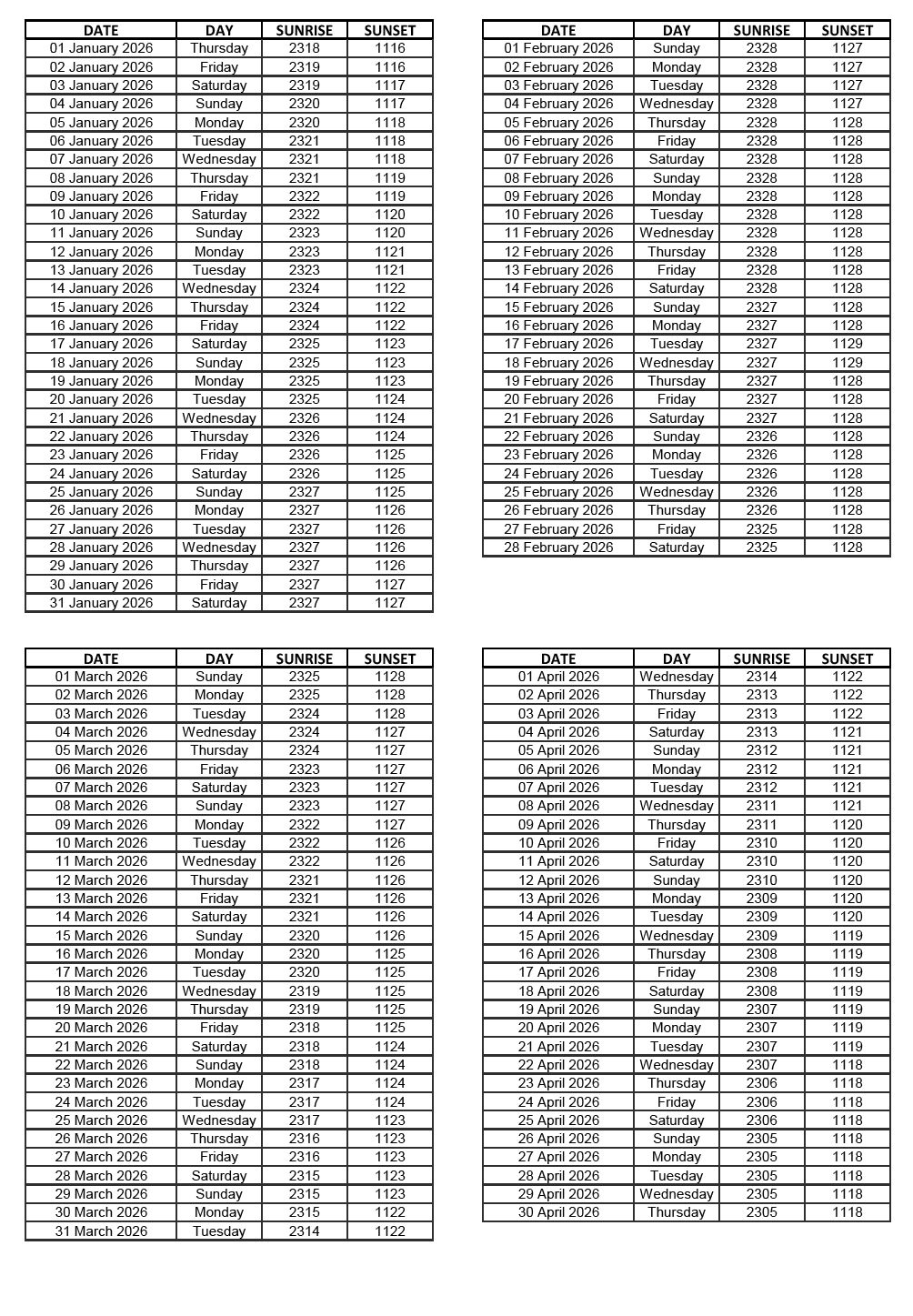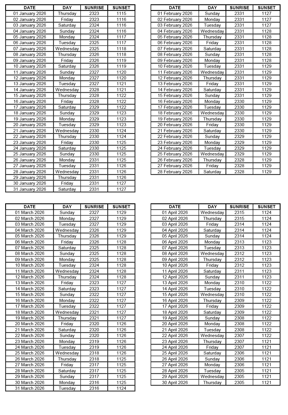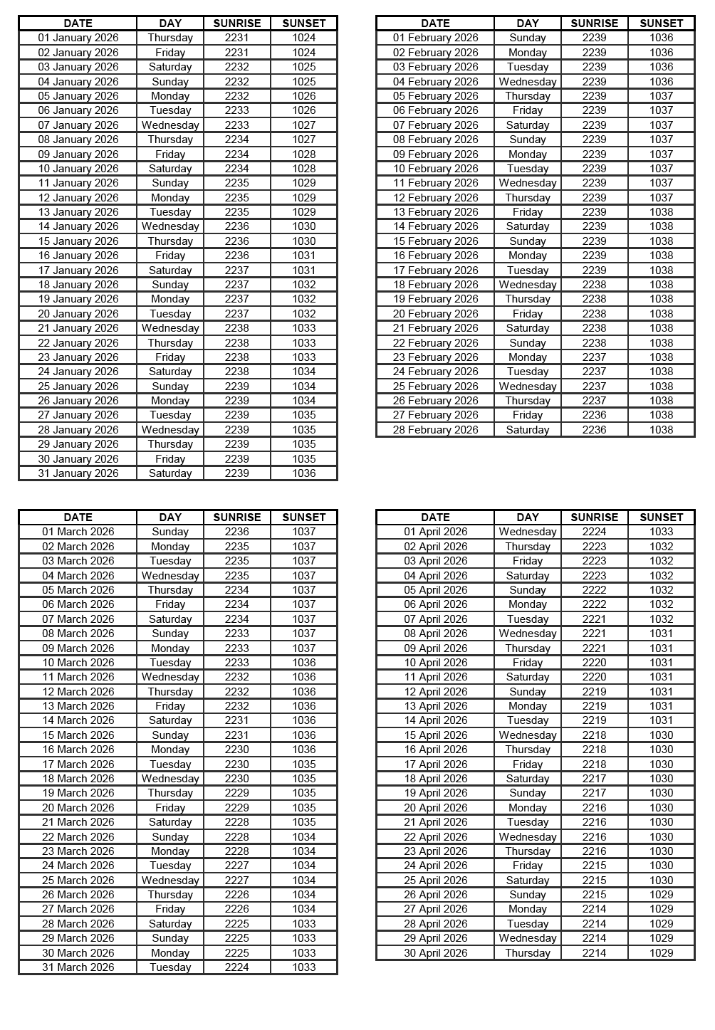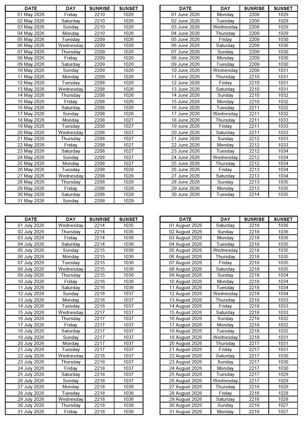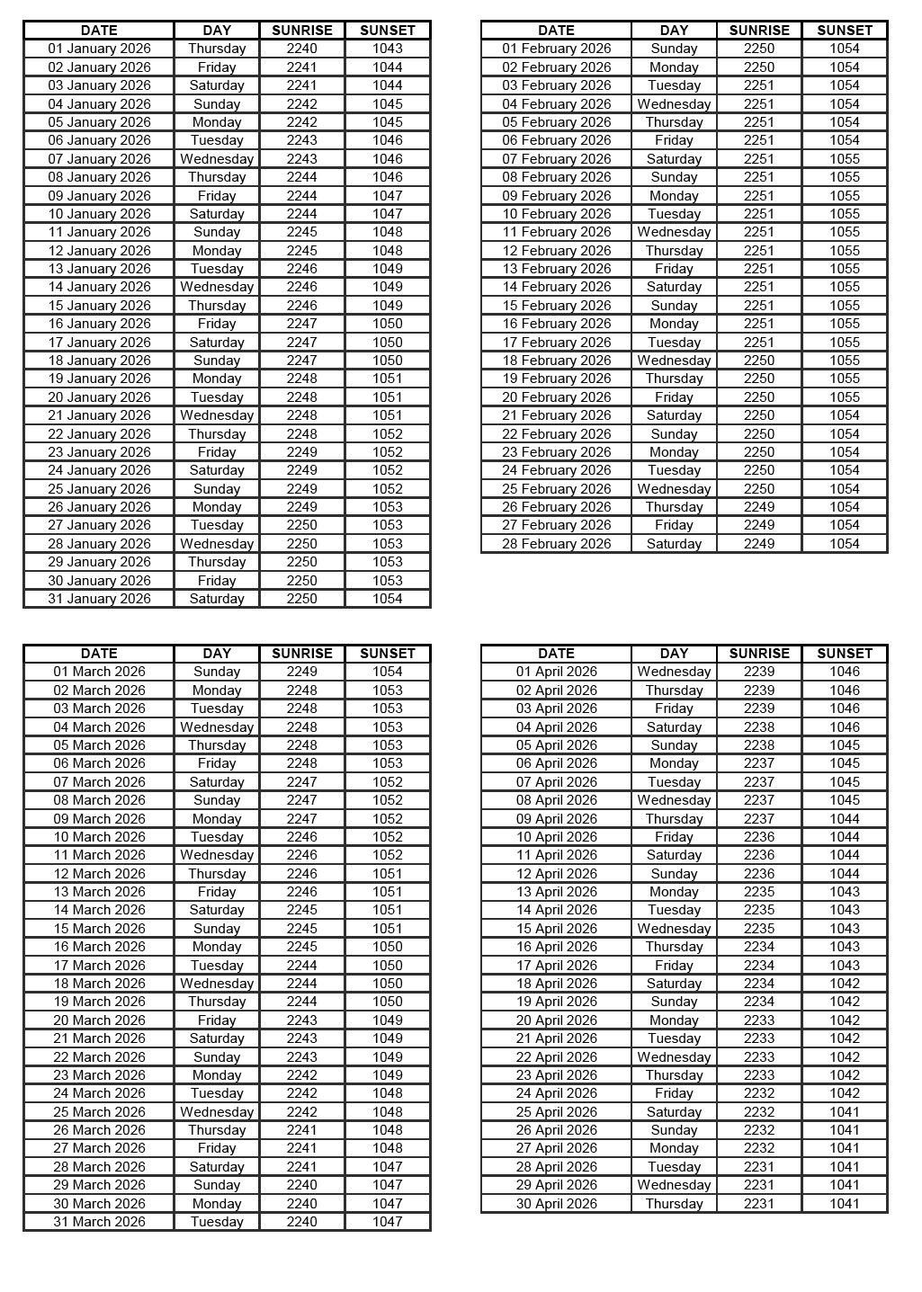GEN 2.7 SUNRISE/SUNSET TABLES