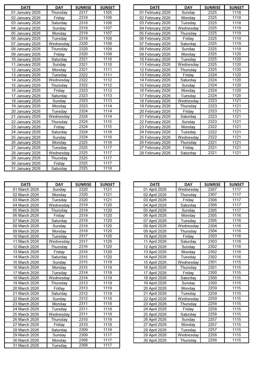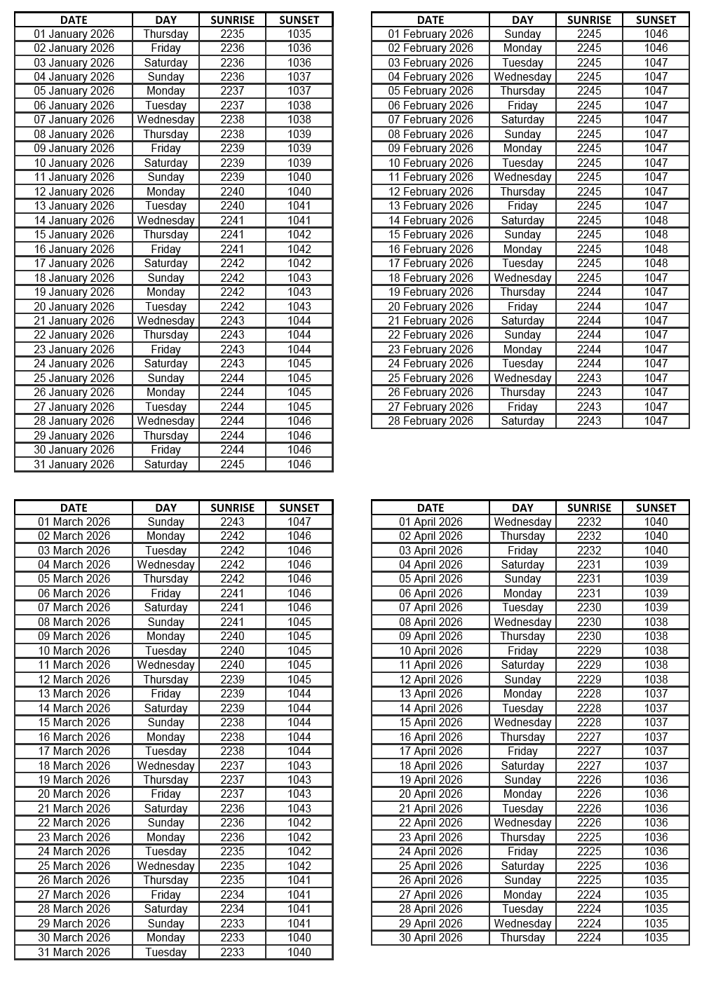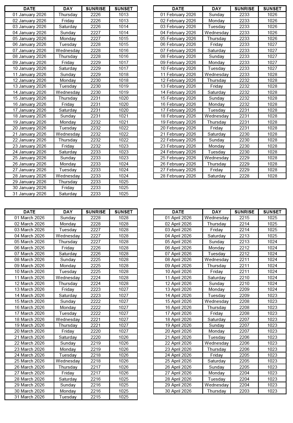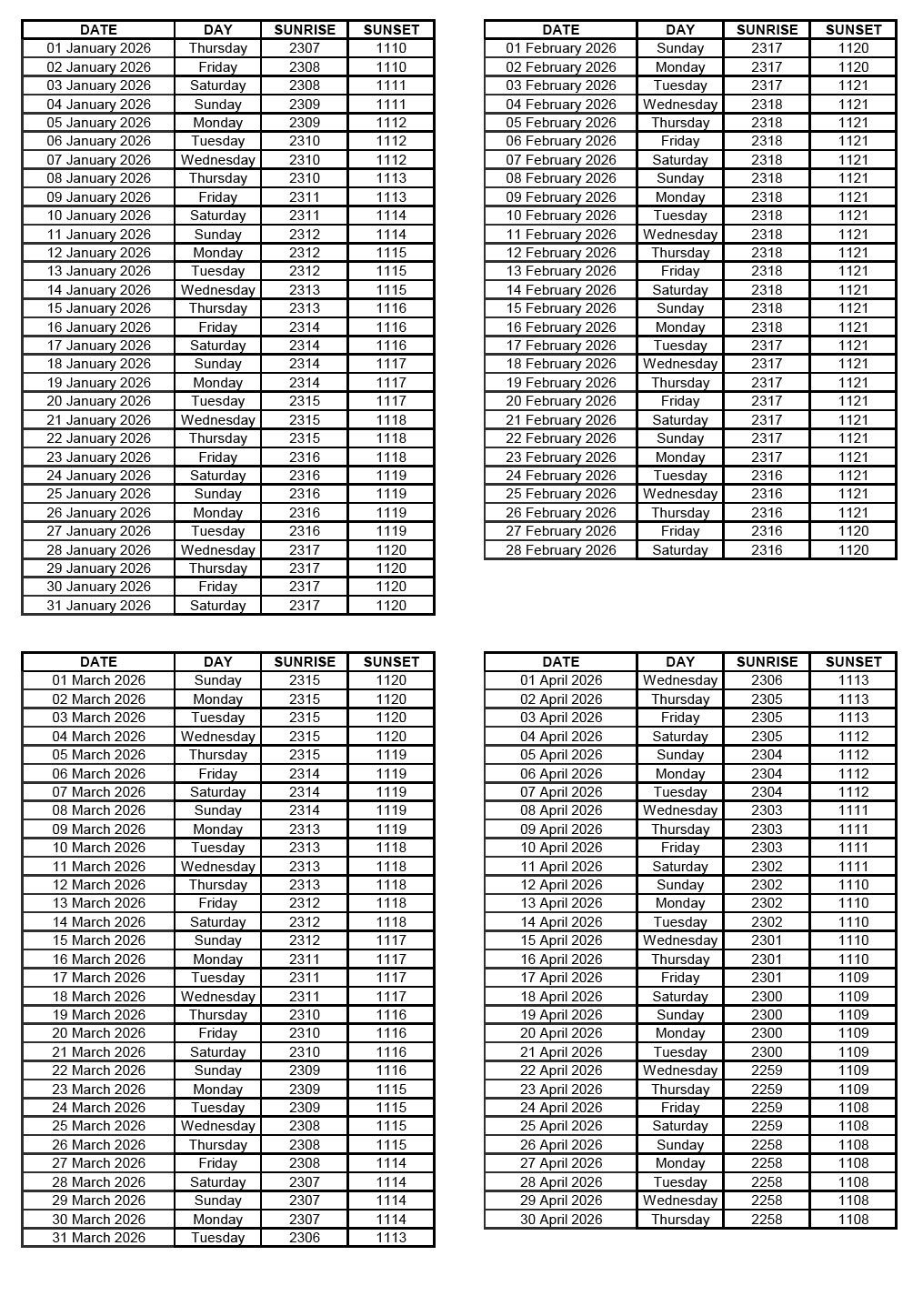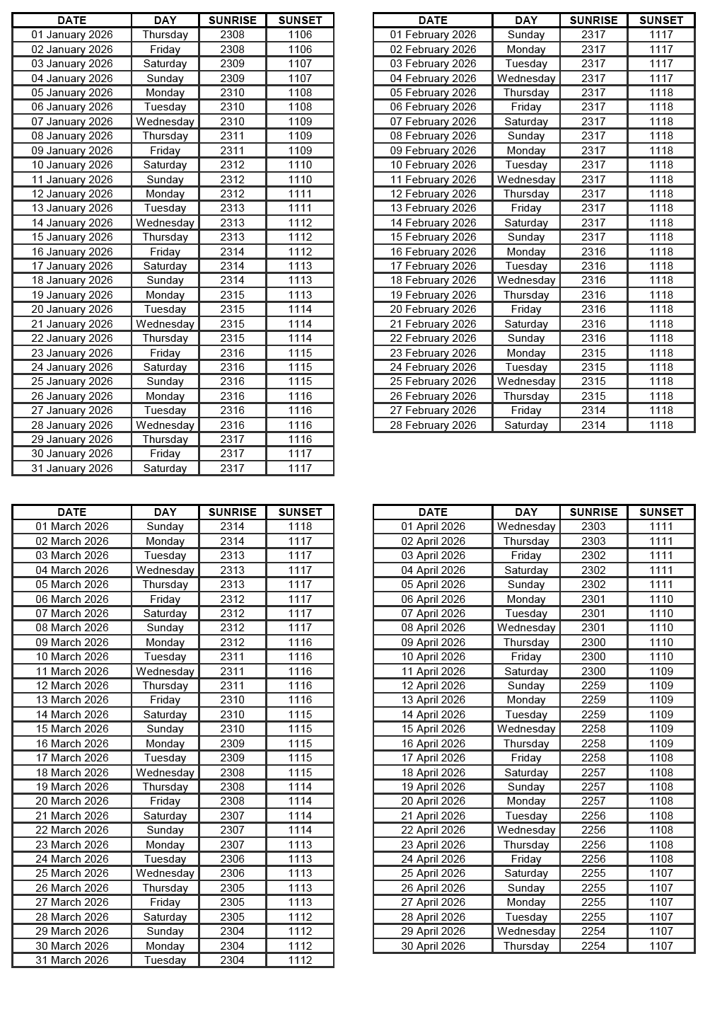 GEN 2.7 SUNRISE/SUNSET TABLES